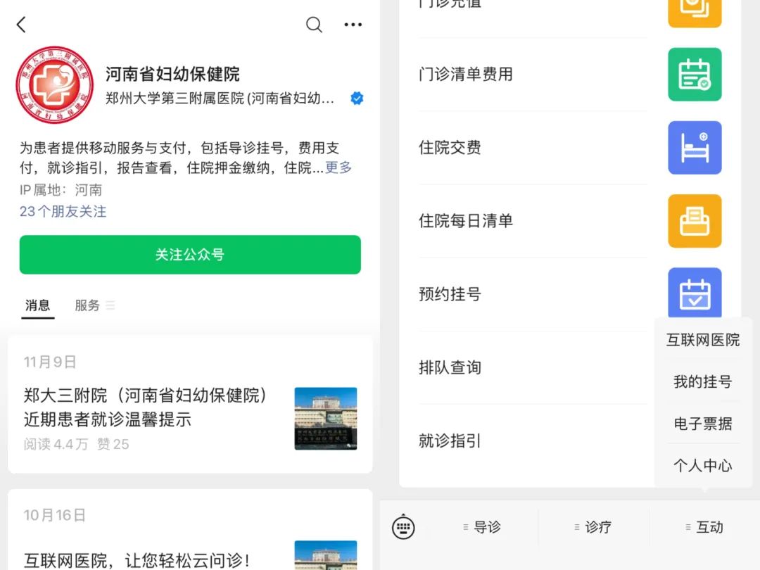 微信关注“郑州大学第三附属医院(河南省妇幼保健院)服务号”→【互动】进入互联网医院页面。