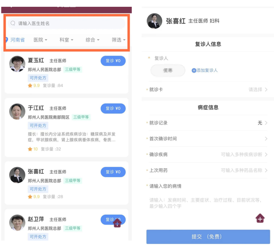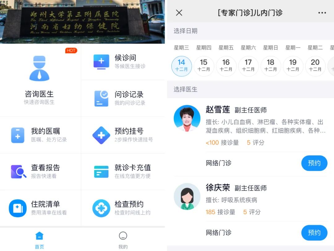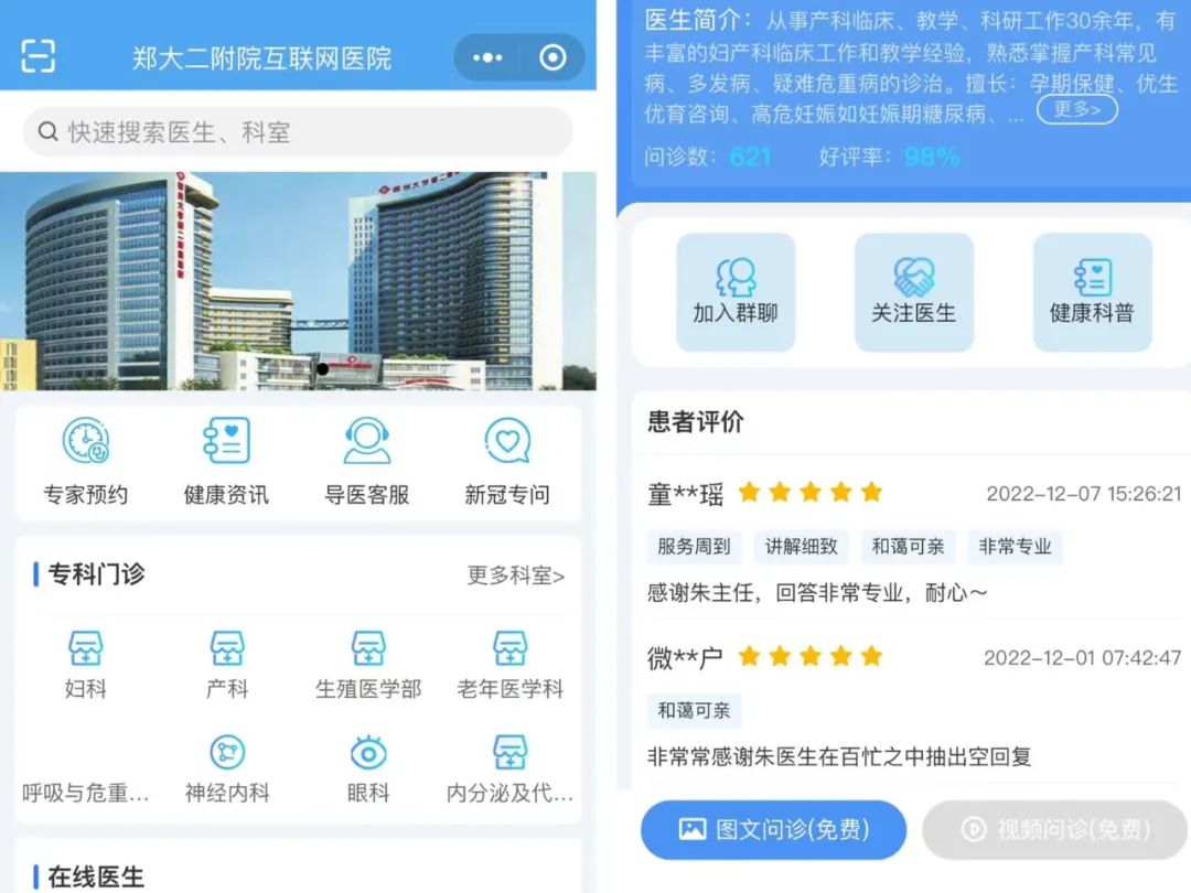 微信小程序搜索“郑大二附院互联网医院”进入问诊页面,点击妇科、产科等科室选择【医生列表】,选择专家进行问诊。