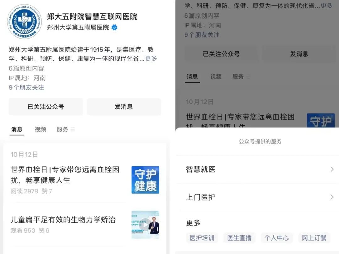 微信关注“郑大五附院智慧互联网医院服务号”→【服务】进入【智慧就医】页面。