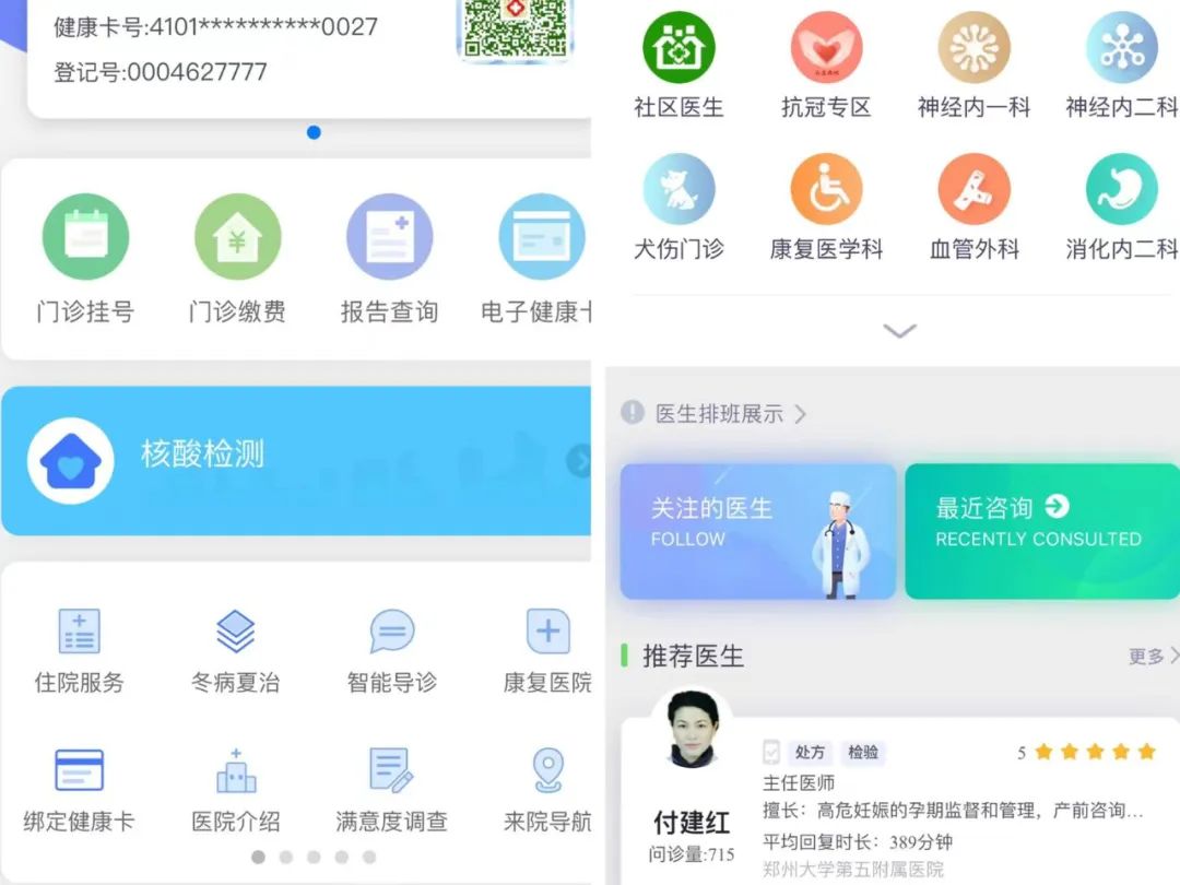 选择科室及专家,完成患者建档等流程,进行在线问诊等服务。