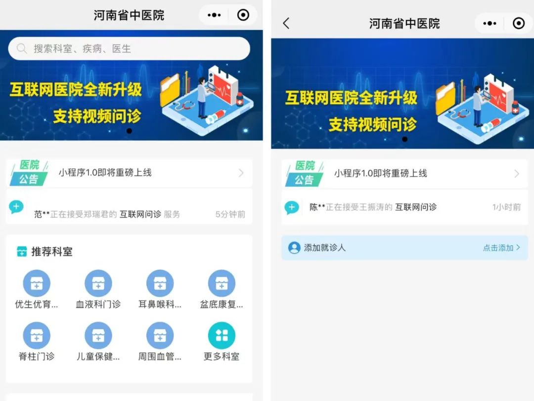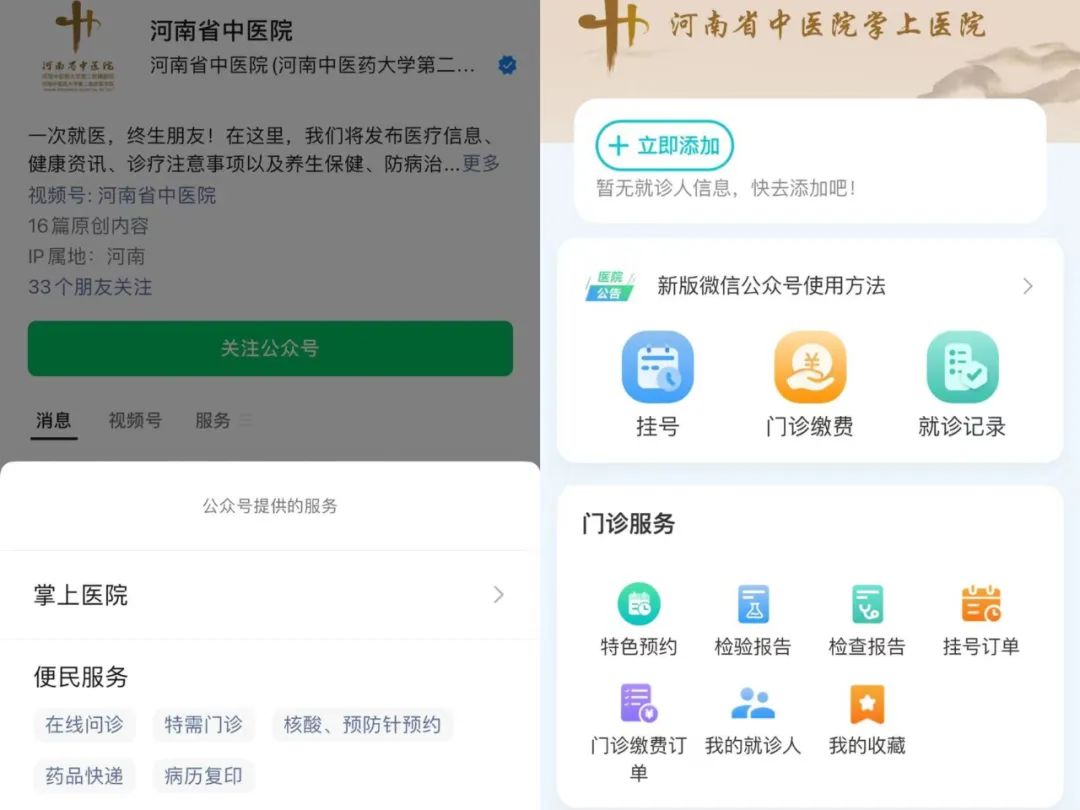 微信关注“河南中医院大学第一附属医院”→【服务】进入【互联网医院】页面,或微信小程序搜索“豫中一”。