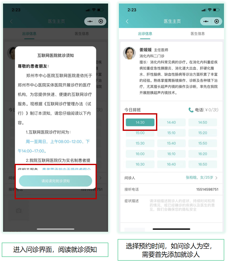 点击【咨询医生】,选择科室、预约问诊时间发起预约问诊。