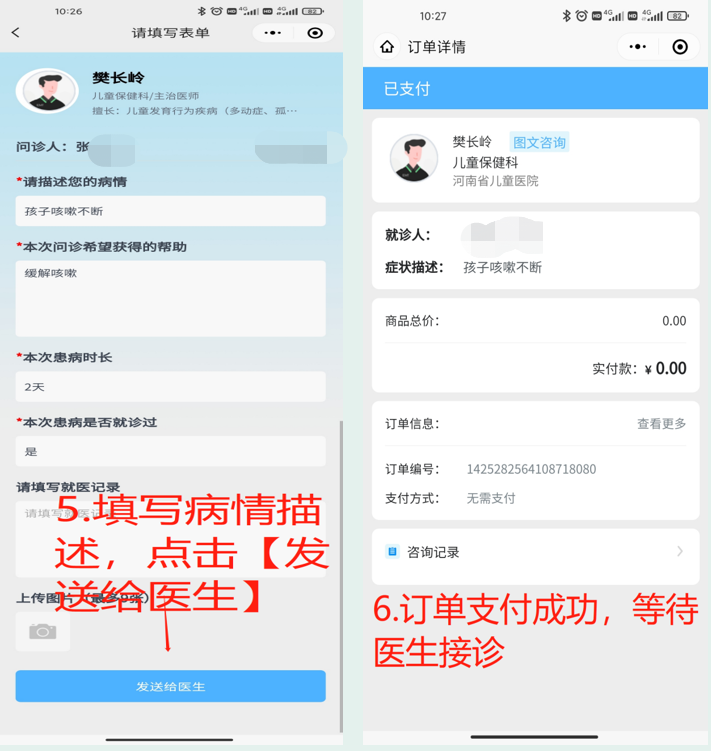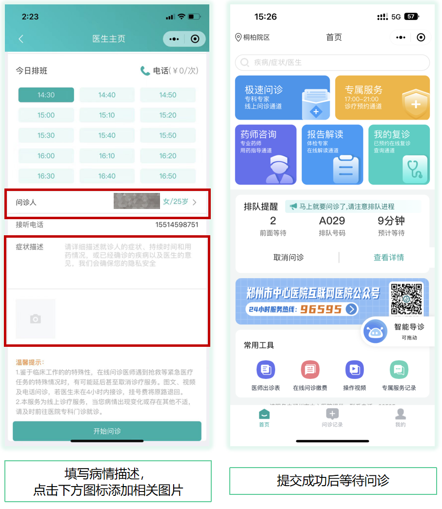 选择医生进入【医生详情页】→点击【图文问诊/电话问诊/视频问诊】发起问诊→点击【确定】(可查看问诊说明)→选择【就诊卡】(没有就诊卡的可新建/绑定就诊卡)→输入问题描述(可上传检验检查图片)→点击【发送给医生】→支付问诊费→订单支付成功,等待医生接诊。