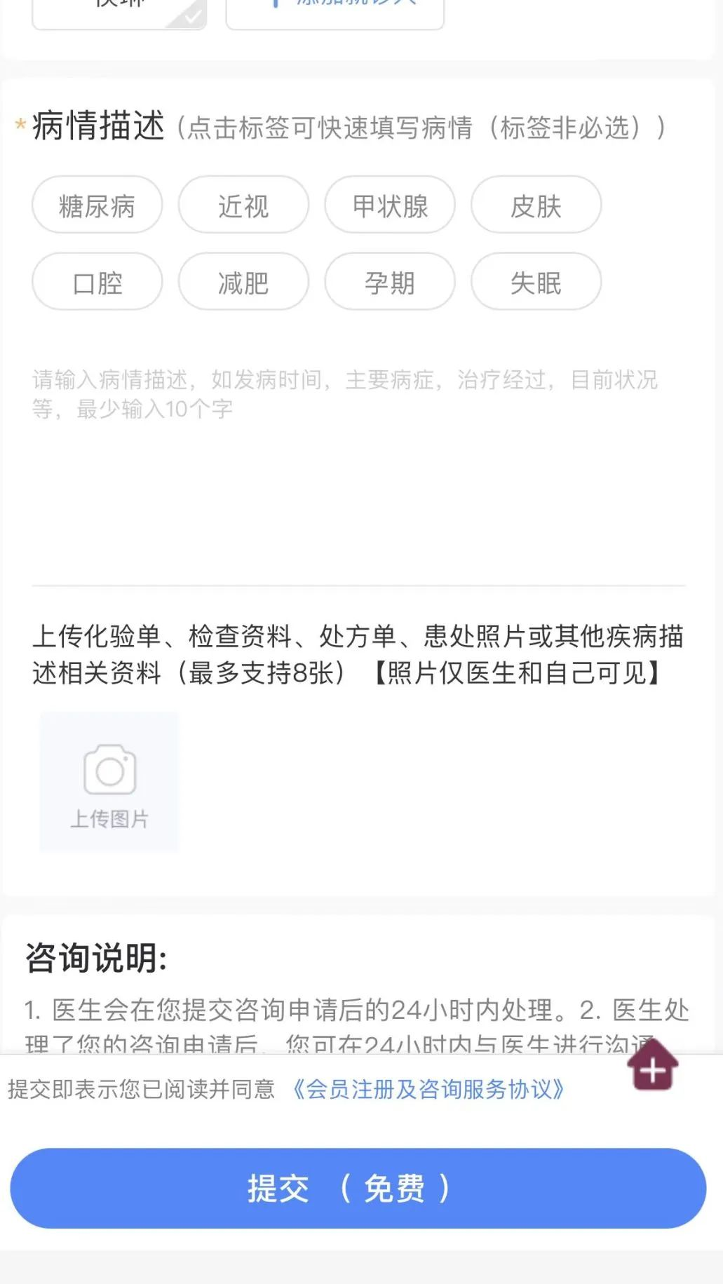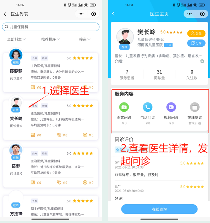 点击在线咨询,完成患者建档等流程,选择科室及专家发起问诊。