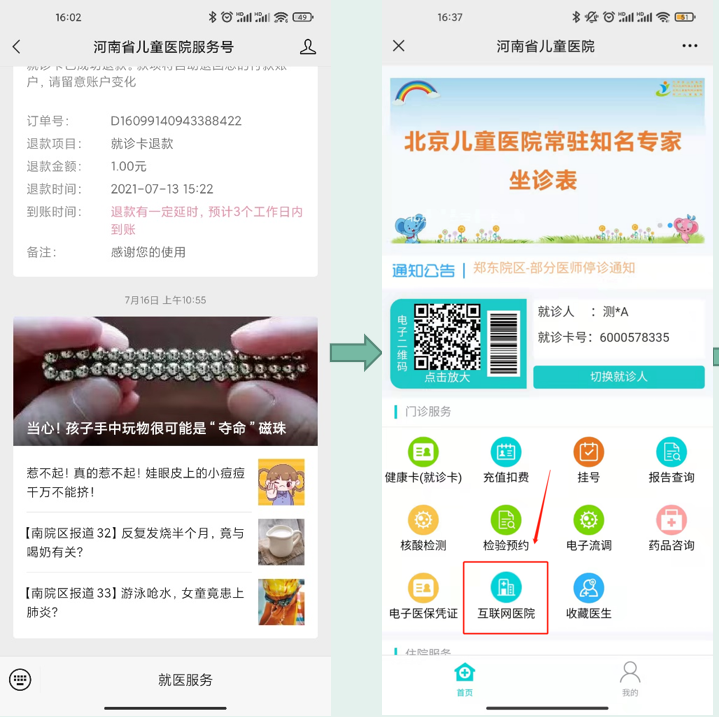 关注“河南省儿童医院服务号”→【就医服务】→住院服务模块【互联网医院】。