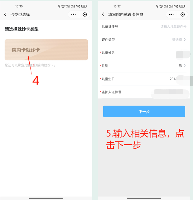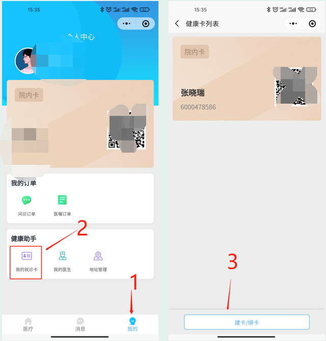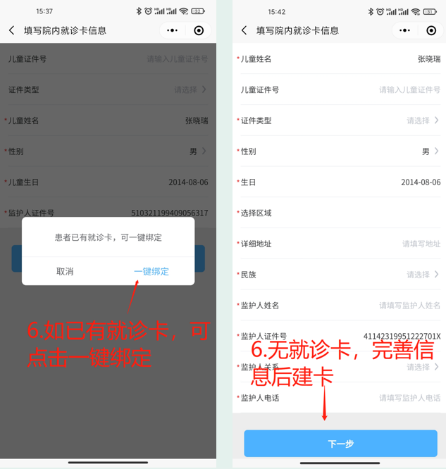 1.在【我的】个人中心→我的就诊卡→点击【建卡/绑卡】→选择【卡类型】→输入儿童及监护人信息,按提示建卡/绑卡。
