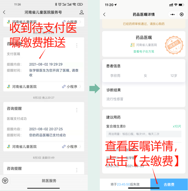 2.接收到药品医嘱支付信息,点击查看医嘱详情,根据提示点击支付。