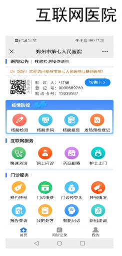郑州市第七人民医院互联网医院功能包括互联网服务、门诊服务、住院服务、便民服务、健康服务等几大功能。其中互联网服务为群众提供线上问诊、快速咨询、护士上门、药品邮寄等贴近民生的便捷服务。
