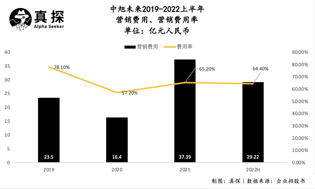 营销费用高企就是作证。从2019年至2022年上半年,中旭未来的销售费用分别是23.50亿元、16.43亿元、37.39亿元、29.22亿元,占总营收比重分别高达78%、57%、65%和64.4%,招股书中显示,这些开支主要都花在了向合作网上媒体平台支付的网上流量获取费、线下营销开支及明星代言费。