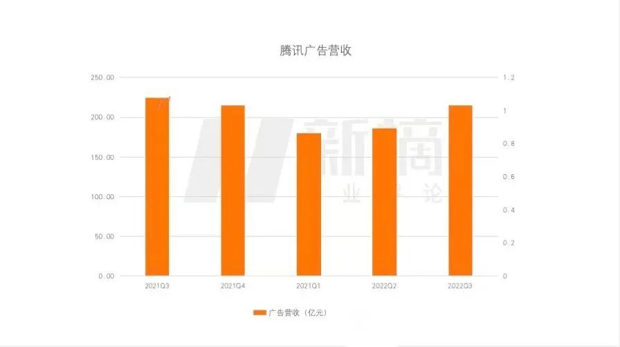 从去年三季度的225亿,降至2022年一季度的180亿,虽然二季度时小幅上涨4%,三季度主要受视频号的影响增长15%至人民币215亿元,但与去年同期相比还是下降了5%。