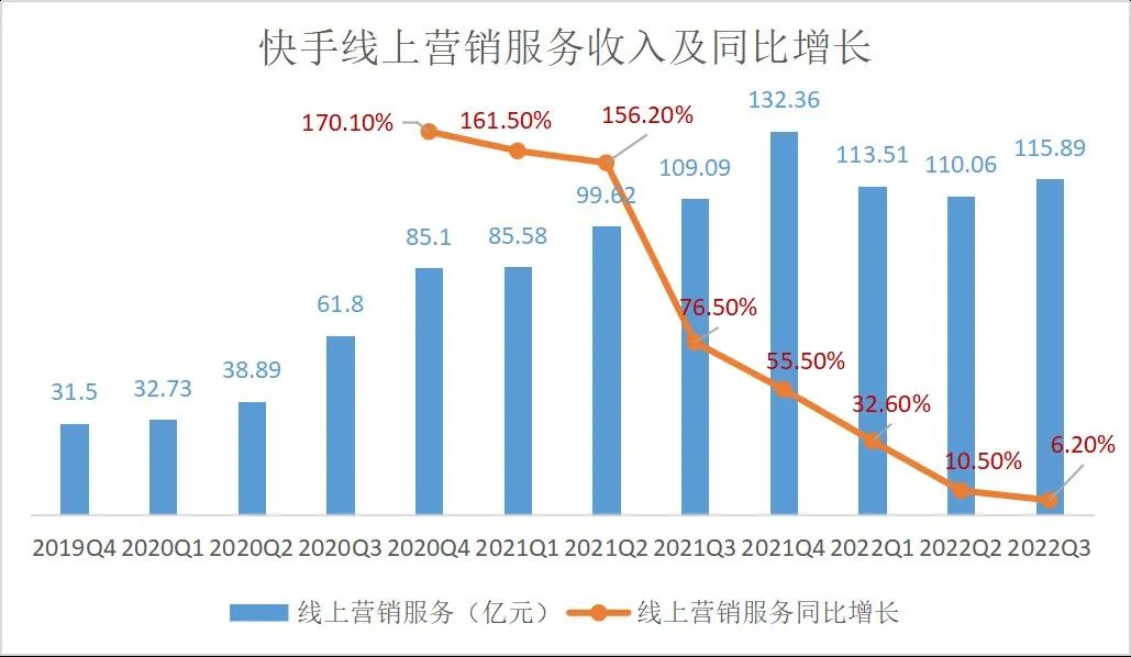 由于服务、商业化产品能力以及广告 ROI 的提升,快手Q3 广告主和广告主投放广告数量同比增长超过 65%,扭转了 Q1 和 Q2 连续两季度营收下降情况,不过116亿元线上营销服务收入同比增长6.2%的数据相比上季度10.5%的增速,还是出现了放缓迹象。