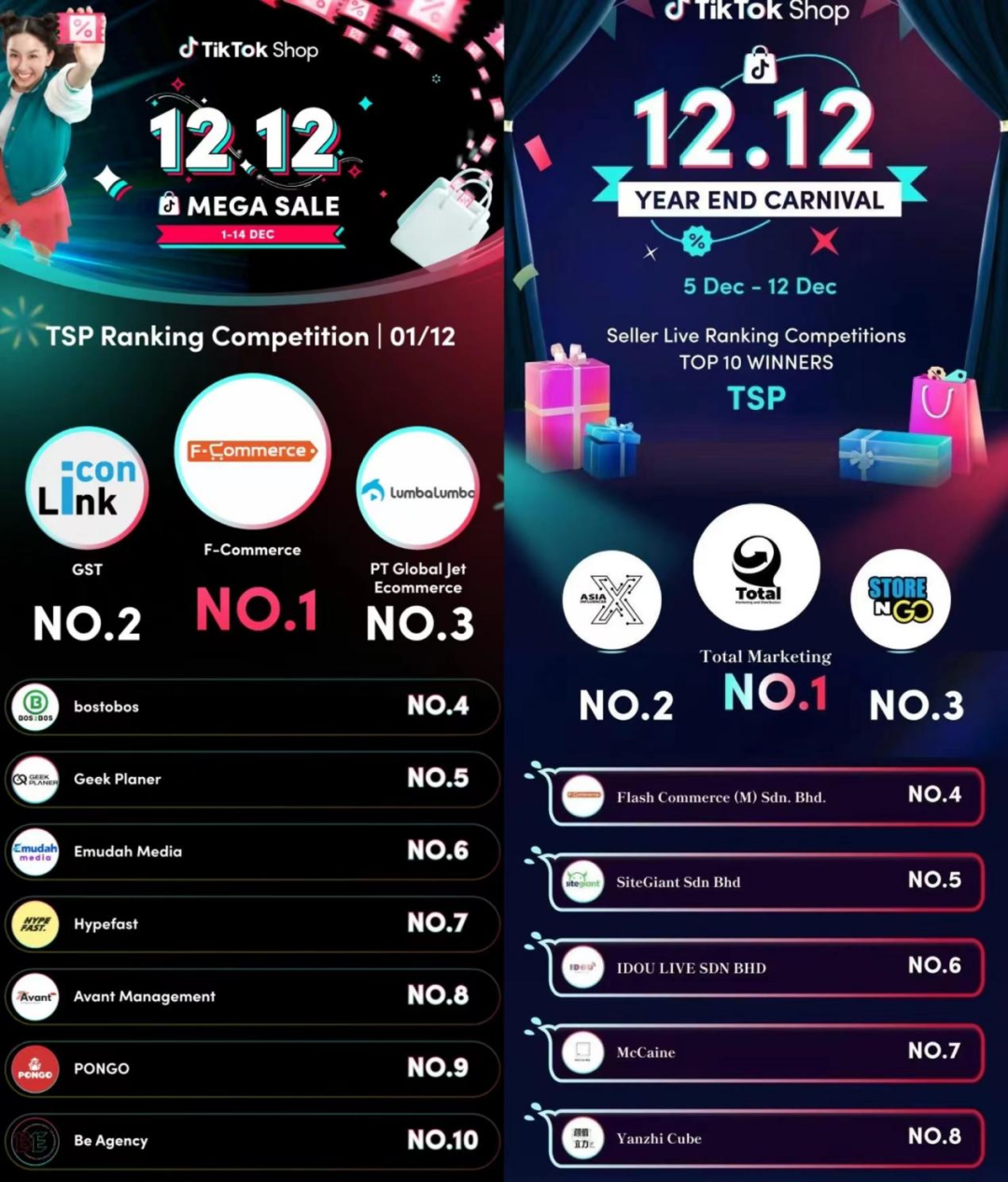 在刚出炉的印尼“Tiktokshop1212megasale”,也就是“双12”的Tiktok服务商排行榜中,F-Commerce又连续十二天排在了第一名,现在,F-Commerce也成为诸多国内知名品牌信赖的东南亚TikTok跨境电商代运营合作方。