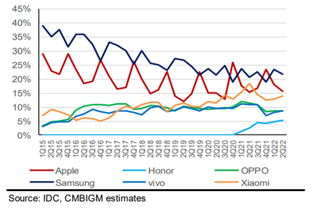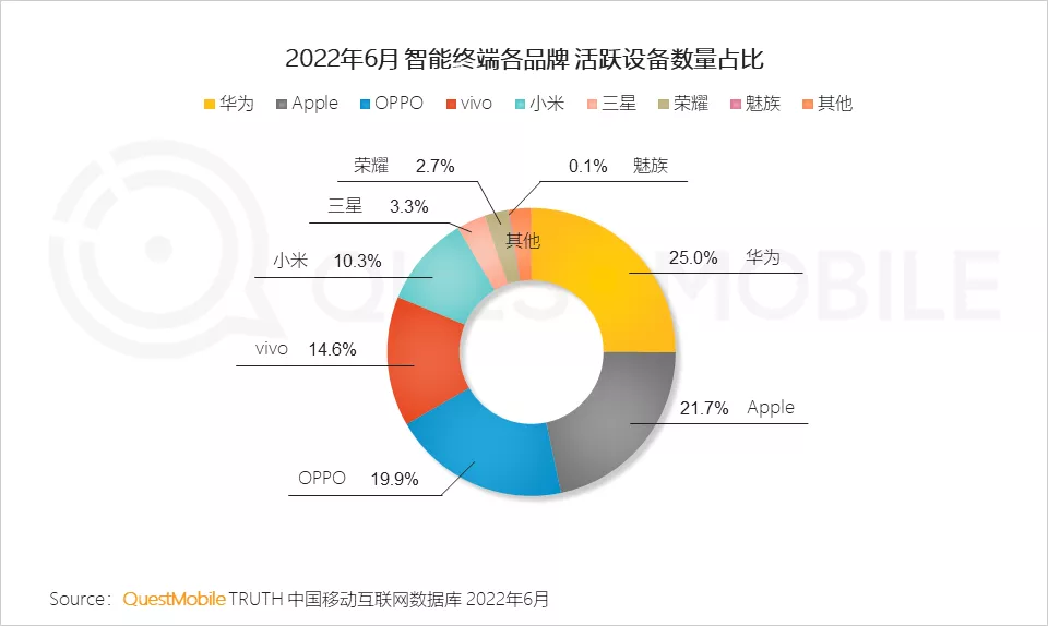 另一方面,在QuestMobile最近发布的2022中国智能终端市场半年报告中,从6月活跃设备数量占比来看,TOP5的华为、Apple、OPPO、vivo、小米分别为25%、21.7%、19.9%、14.6%、10.3%,总体占比超过九成。