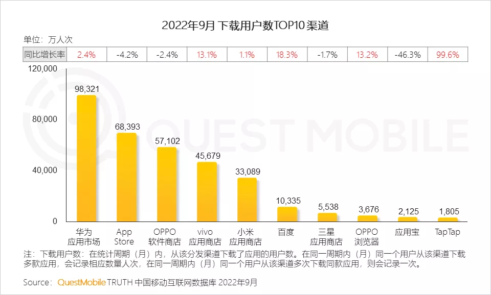 但是反映在智能终端系统层面的用户数量上,根据《QuestMobile2022中国移动互联网发展年鉴(整体篇)》显示,荣耀应用商店并没有进入下载用户Top10的渠道。作为各家手机品牌预装的应用下载渠道,无疑也可以从侧面反映荣耀手机系统层面的用户黏性偏低。