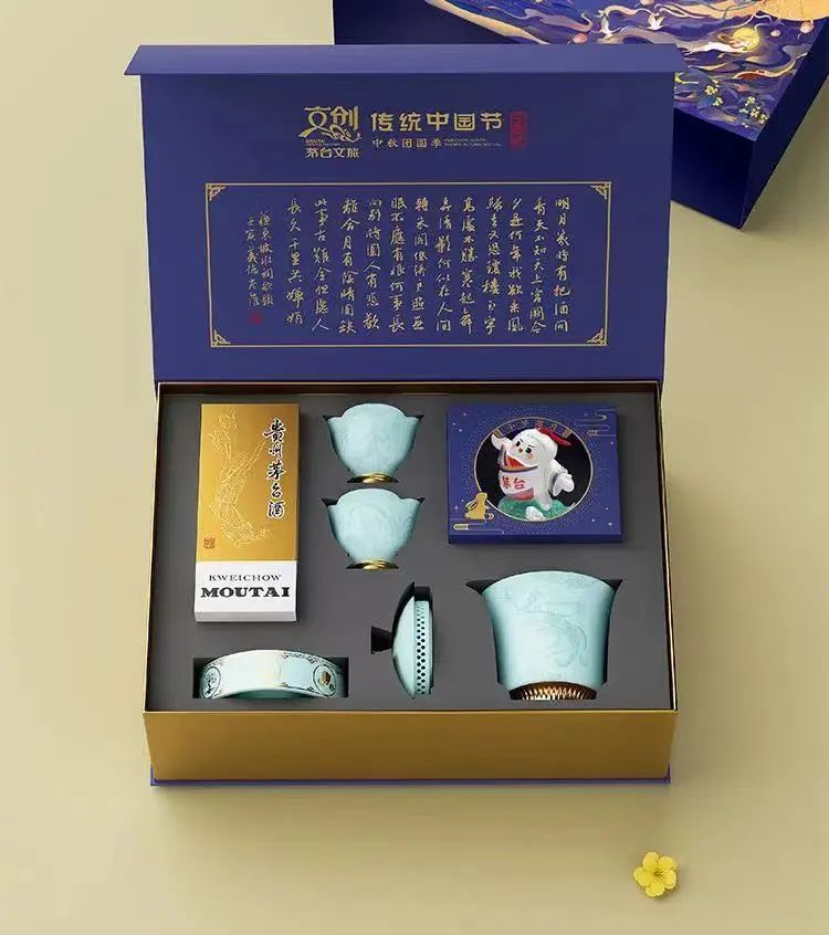 今年中秋团圆季,贵州茅台文旅公司推出“传统中国节·中秋团圆季”文创产品。套盒内包含200ml贵州茅台酒一瓶,月下清影茶具套组(壶盖*1、壶身*1、壶承*1、茶杯*2)一个,举杯邀约中秋特别版小茅手办一个。