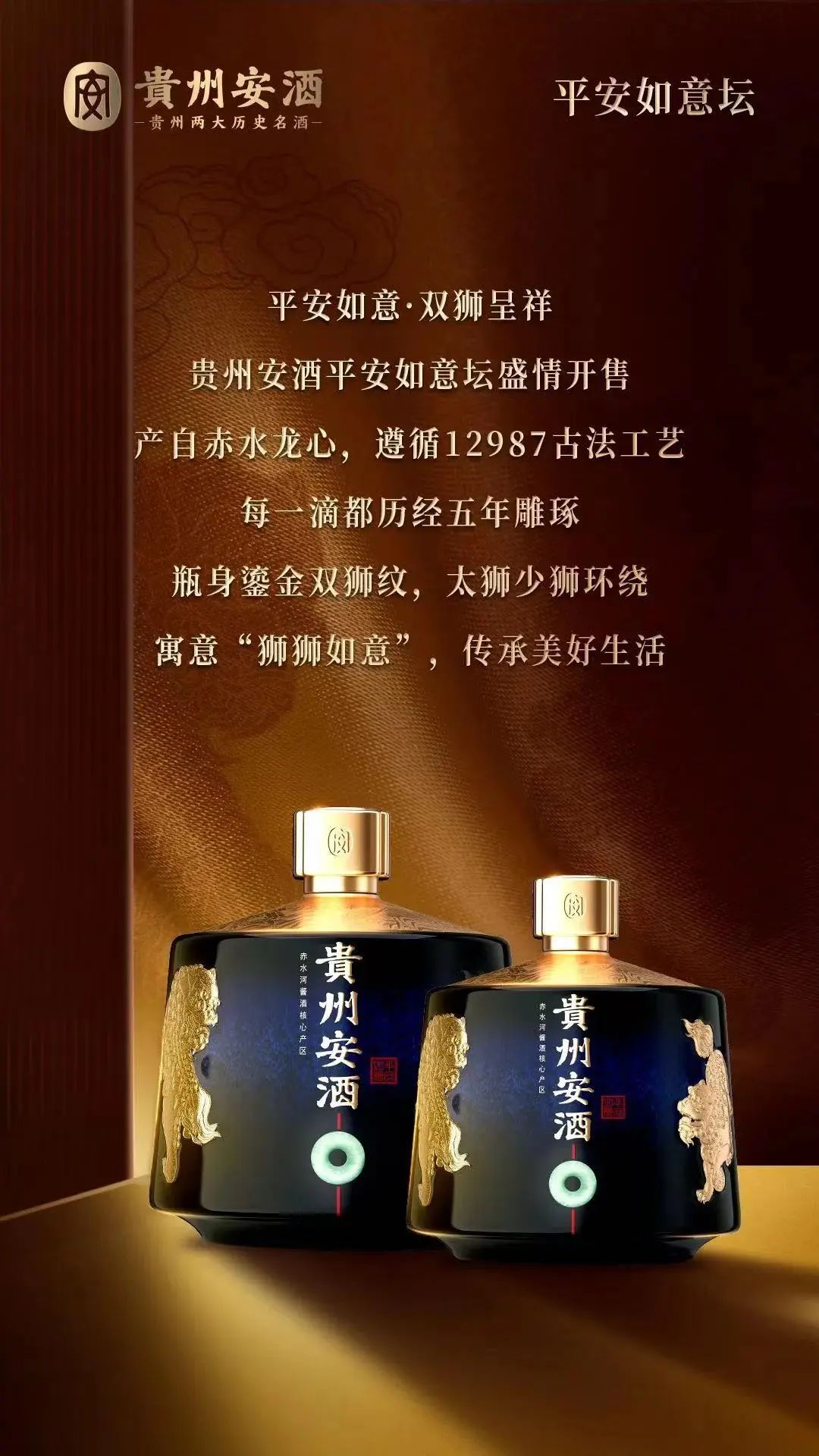 平安如意坛整个器型,是“安”字的变体。采用五年以上储存的3、4、5轮次的酒体,瓶身清晰可见双狮环绕,寓意狮狮(事事)如意。外形包装设计精美,寓意吉祥,占位特殊的“坛”型酒,与之前产品共同构成新阶段的安酒产品阵营。