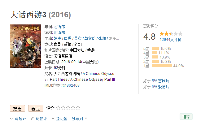 《大话西游3》票房一路高歌的同时,口碑却一路走低,截至19日上午,影片在豆瓣网上的评分已经降至4.8分,接近60%的网友给了低于三颗星的评价,众多网友评论也以吐槽为主,大批网友认为这部作品毁掉自己心中的经典。