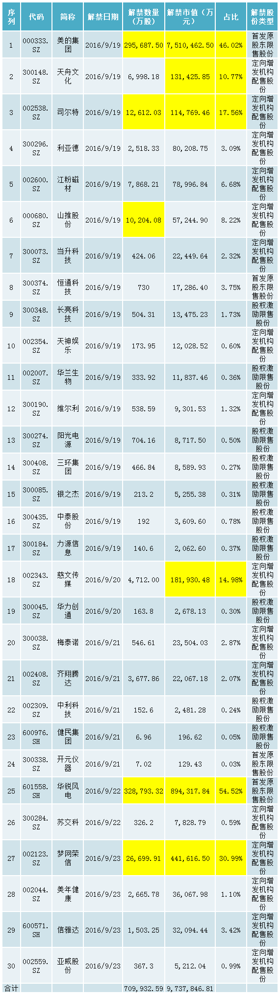 以9月14日收盘价计算,本周解禁市值前三位的分别是美的集团、华锐风电、梦网荣信。