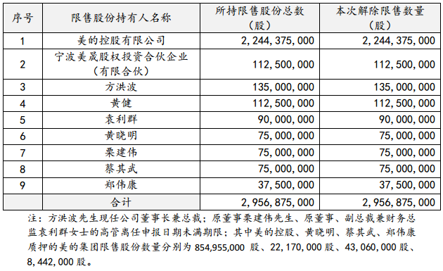 公告表示,美的控股暂无计划在限售股份解除限售后六个月内通过深交所竞价交易系统出售以上解除限售流通股。美的控股如计划通过证券交易所集中竞价交易减持公司股份,应当在首次卖出的15个交易日前预先披露减持计划,在三个月内通过证券交易所集中竞价交易减持股份的总数不超过公司股份总数的1%。