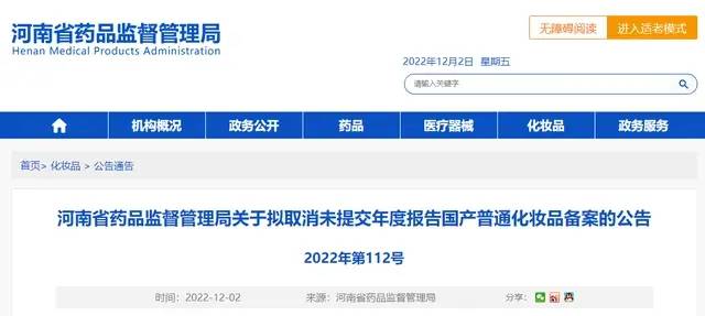 近日,湖北、河南、吉林等地药监局接连发布公告称,拟取消未按要求于2022年3月31日前提交年度报告、且未于6月30日前完成整改的国产普通化妆品备案,只因其未能证明符合法律法规、强制性国家标准和技术规范情况。