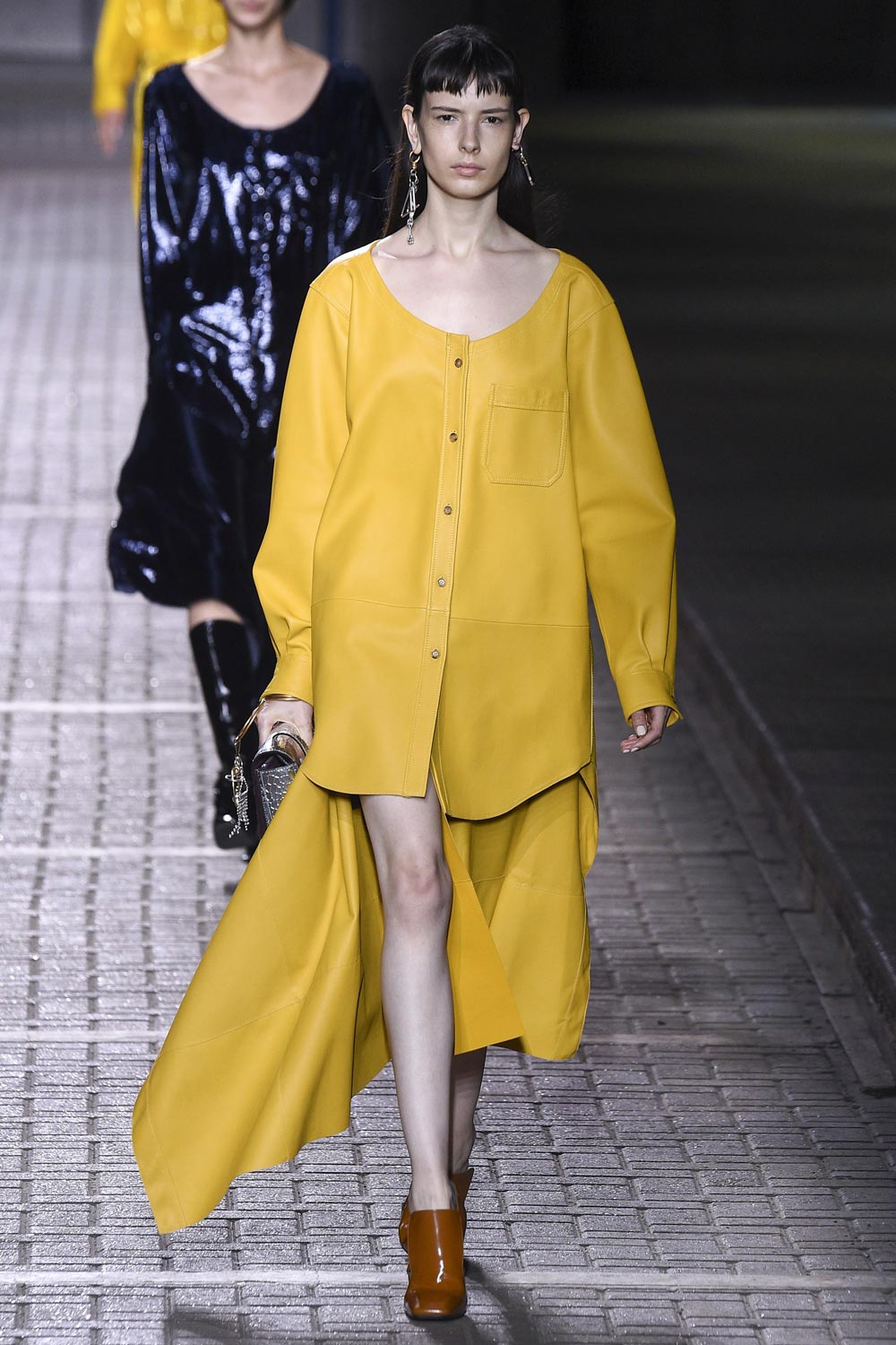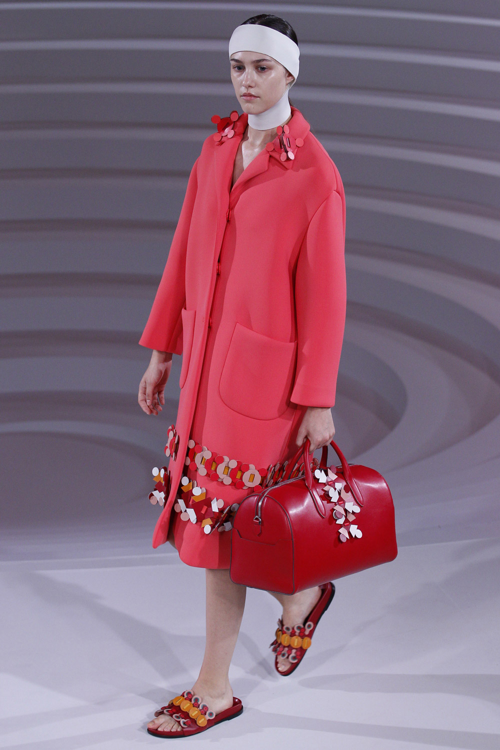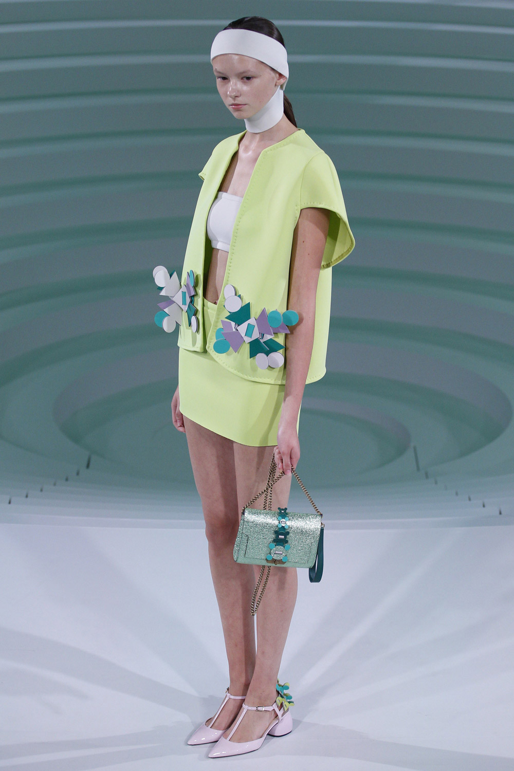 在新一季中,Anya Hindmarch首度发布成衣系列,因而整体造型较以往完整度更高。她将春夏系列的色彩定为各色雪芭:桑果、蓝莓、芒果、薄荷……面料多为氯丁橡胶(neoprene),俗称潜水面料,因为主要用于制作潜水服。这种合成橡胶发泡体手感细腻、柔软,塑性强,因而常被时装设计师用于卫衣和大廓型外套。