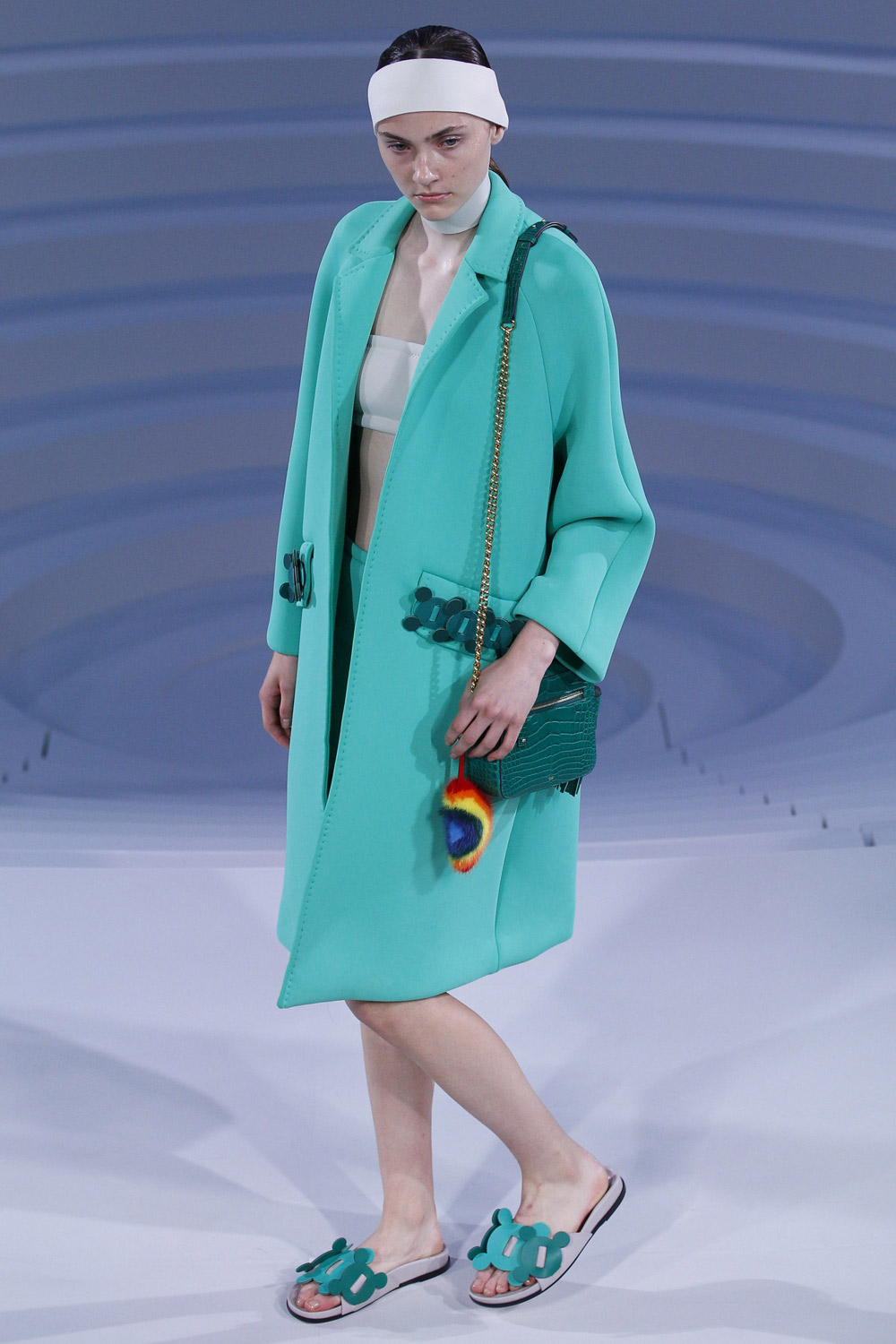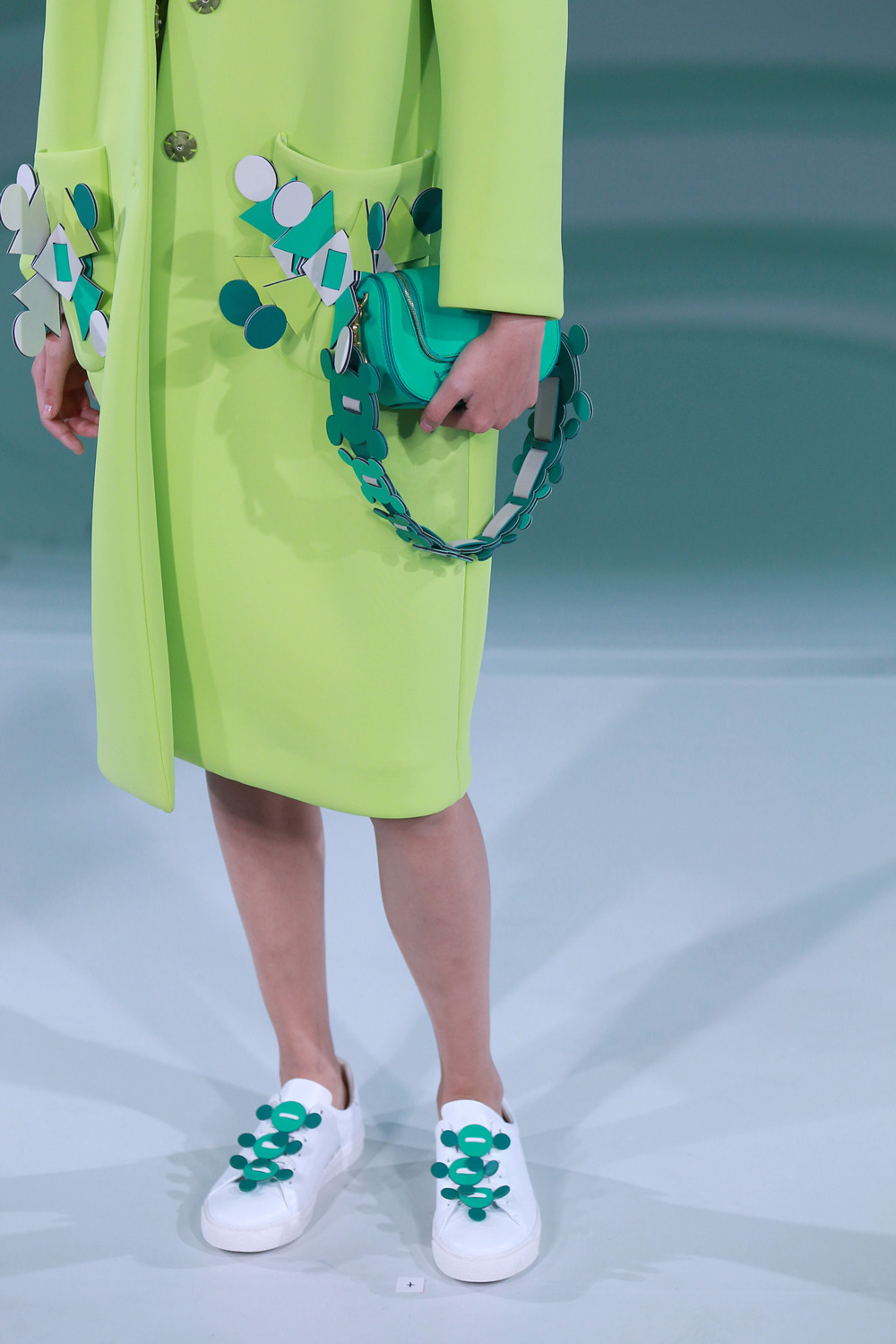 就如秀场所预示的那样,Anya Hindmarch在时装、包袋和鞋子里加入进圆润的几何图形。由多排圆形拼接成的小装饰出现在前襟、口袋、衣袖、鞋跟、绑带等处。或许是设计师不甘于错过毛毛鞋风潮,她在2017春夏系列里特意加了一双毛毛拖鞋,鞋面摊着一枚恶搞的“荷包蛋”——按照模特造型,它的穿着情景设定应该是在海边。