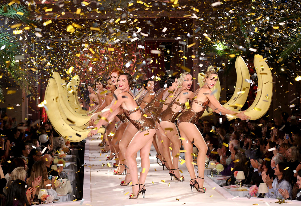 感谢春夏将缤纷色彩、火辣热情与性感娇媚还给我们——Charlotte Olympia的最新系列发布会名为“Let’s go bananas”。这句美国俚语本来语义为:“High起来”,但设计师玩了一个文字游戏。发布接近尾声时,十多位梳着1960年代偏分盘发的金色泳衣女郎捧着大型道具香蕉入场。就如同当时好莱坞歌舞片情节,她们在驻场乐队鼓点和钢琴伴奏下摇摆、抖肩、踢腿。台下自然报以一片尖叫、口哨和掌声。
