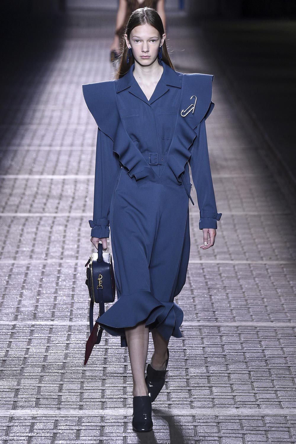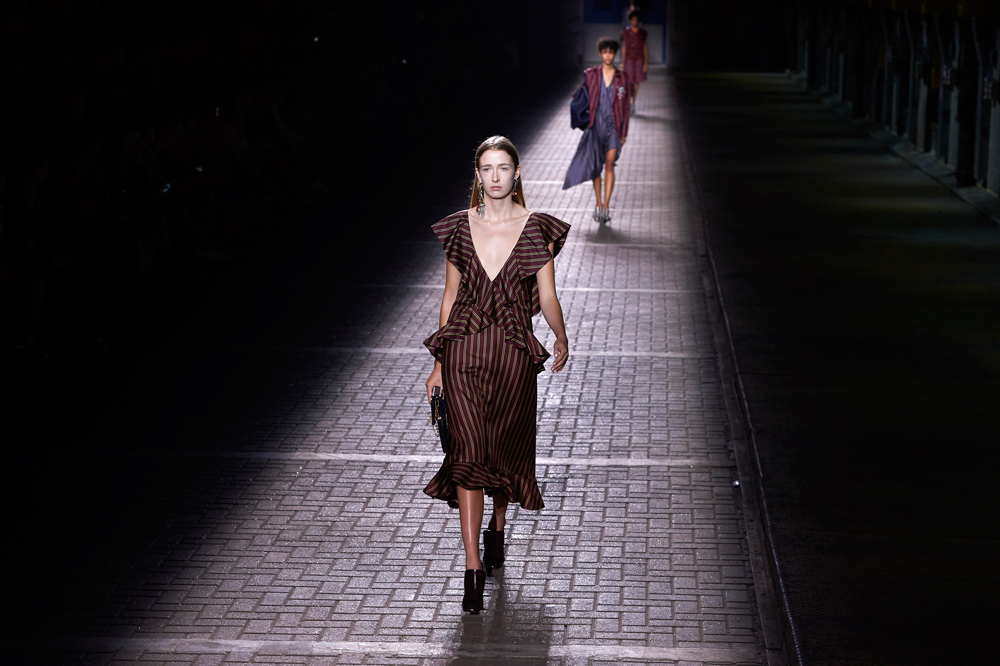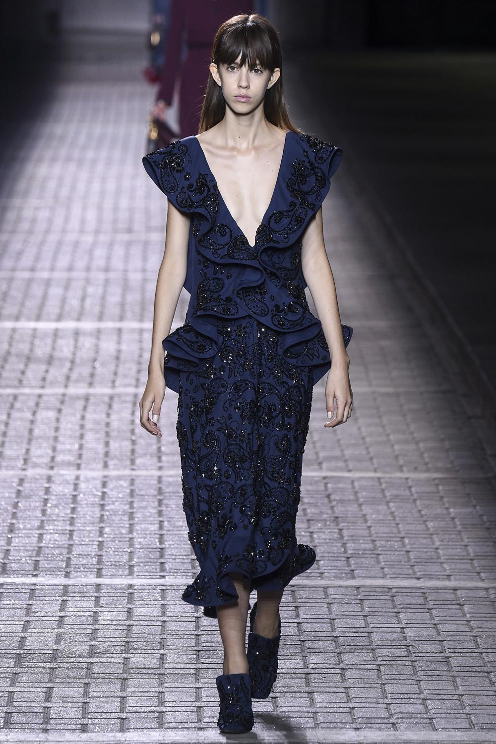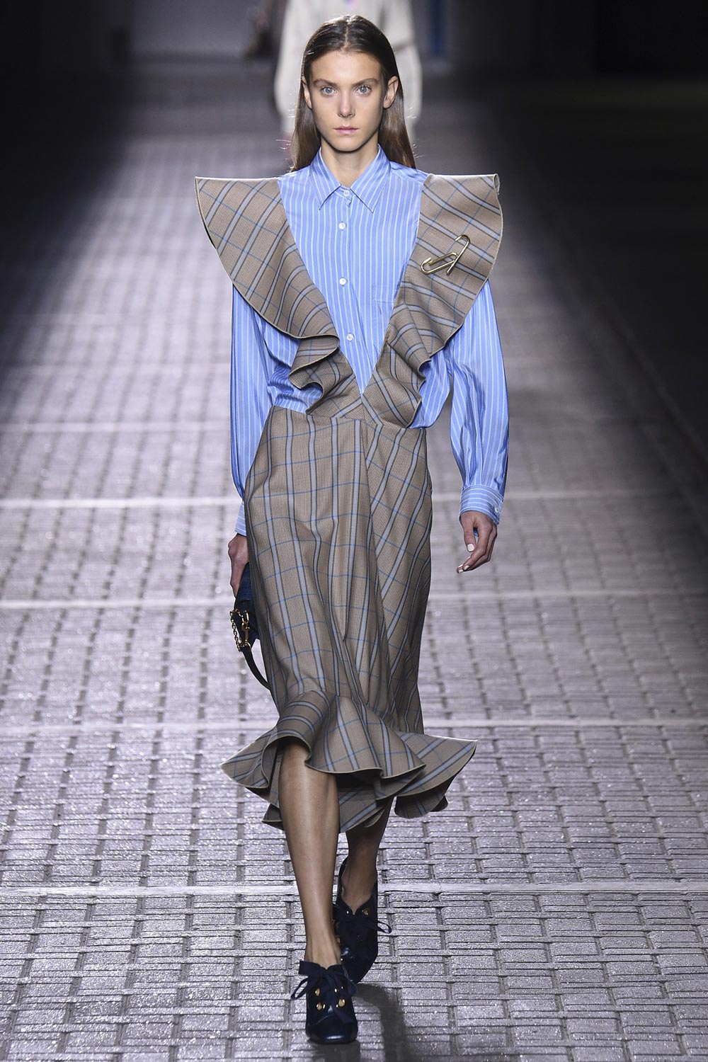 Mulberry在2017春夏系列中玩的是变形与混搭,例如苏格兰裙变为丝质飘逸感半裙;水晶装饰的佩斯利涡旋纹爬满连身裙;条纹制服的版型被彻底打破,向摩登感靠拢。数度出现在裙摆与两肩处的花边更是颠覆了“制服”原有的死板气息。