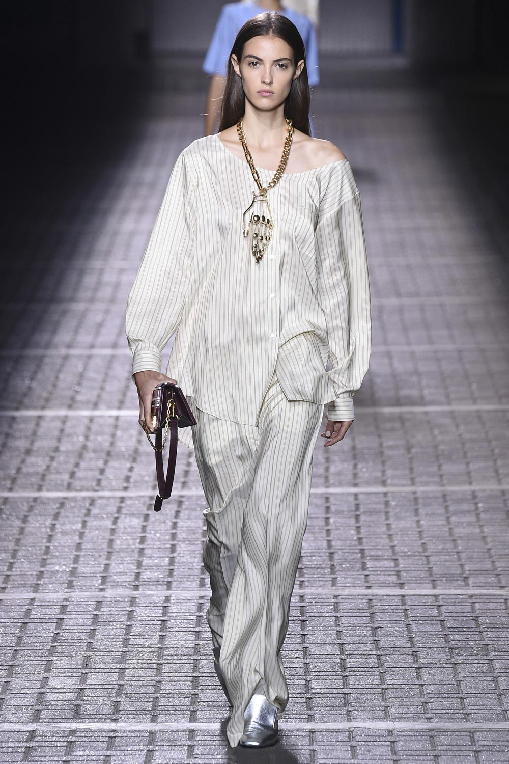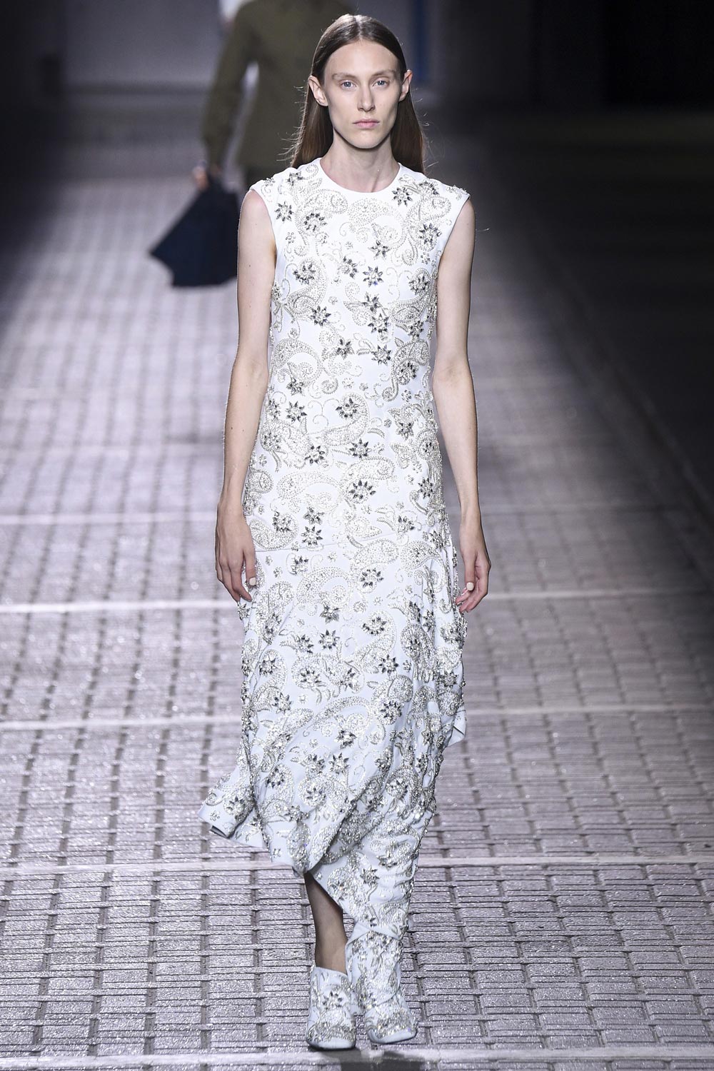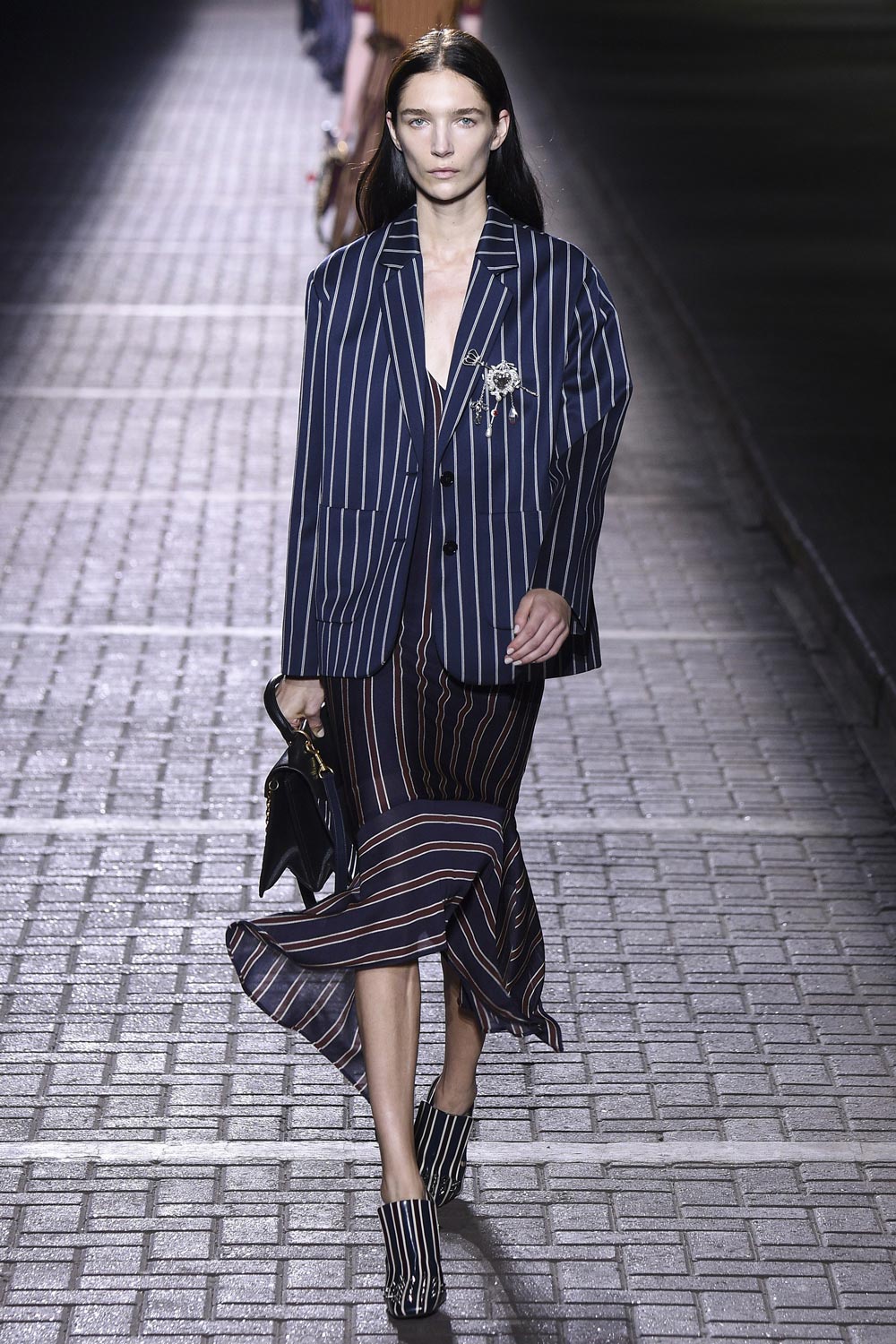 Mulberry在2017春夏系列中玩的是变形与混搭,例如苏格兰裙变为丝质飘逸感半裙;水晶装饰的佩斯利涡旋纹爬满连身裙;条纹制服的版型被彻底打破,向摩登感靠拢。数度出现在裙摆与两肩处的花边更是颠覆了“制服”原有的死板气息。