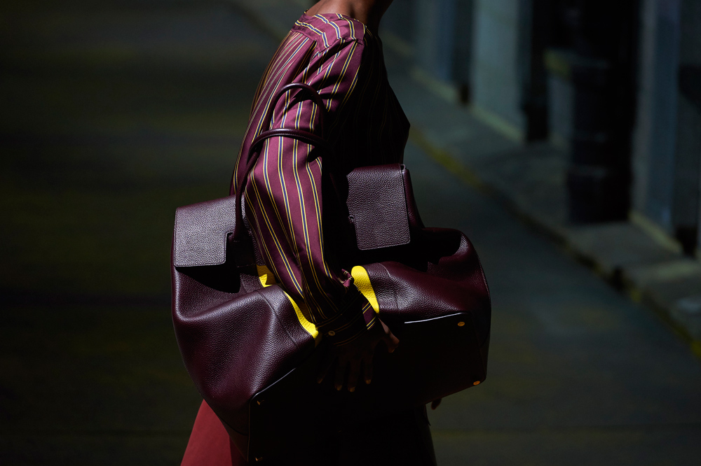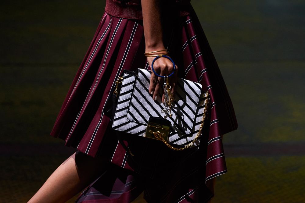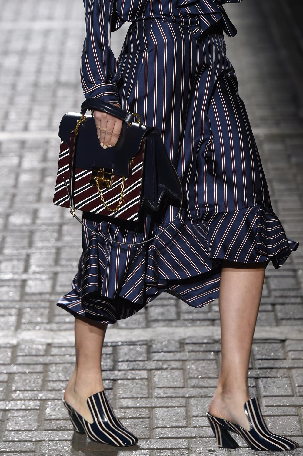 Mulberry在营收主力产品,即包袋上的资源投放向来毫不吝啬。今年6月公司传出近年来首次正面消息——销售额同比增长5%后,Johnny Coca显然被赋予了更多的自由与信任。设计团队对大版Bayswater,即十年前推出的Piccadilly重新调整比例与用色,当然上面也少不了蓝 白红间隔条纹,这三色甚至还被编织成拎包背带。迷你风琴包、饭盒包,中号水桶包…..总之你的购买范围越来越大。