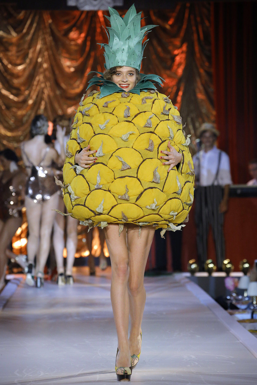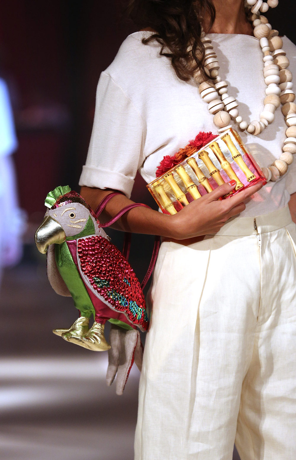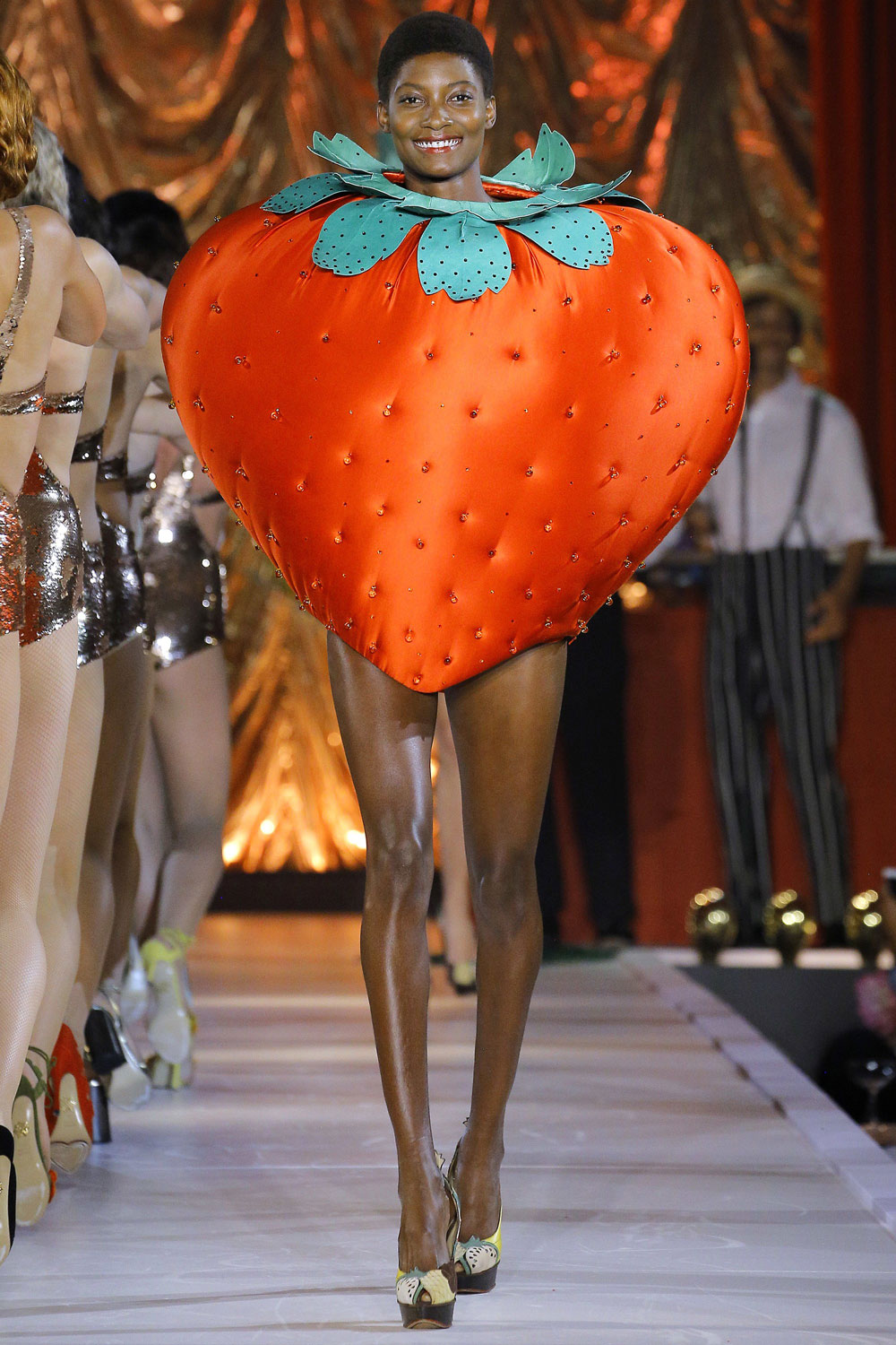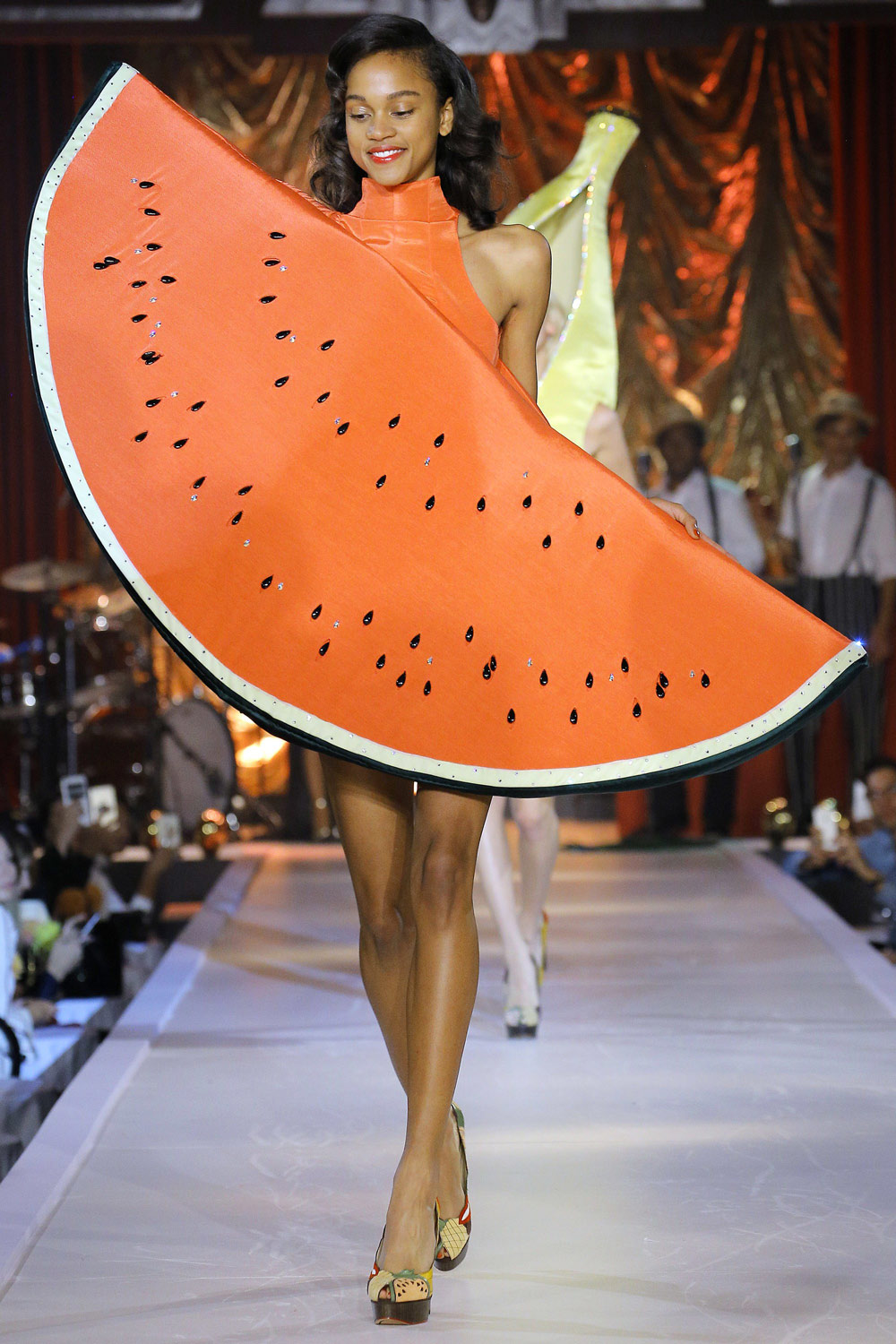这完完全全在向桑巴、嘉年华与巴西科帕卡巴纳沙滩致敬。巴西最擅长波萨诺沃曲风的歌手Bebel Gilberto被邀来现场驻唱。整场发布分为5幕,各自围绕一个小主题。而除了香蕉之外,实则还有身着葡萄、西瓜造型登场的模特。这些可人的水果还构成了鞋子图案,无论是恨天高还是平底鞋都戴着一股热带风。