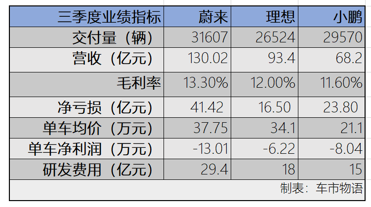 虽然三家企业在三季度的交付量都实现了不同程度的上涨,亏损面却在不断扩大。就连一向以“会赚钱”见长的理想:上一季度的亏损额仅为蔚来、小鹏的零头,也跌入了近几年来三季度的“至暗时刻”。