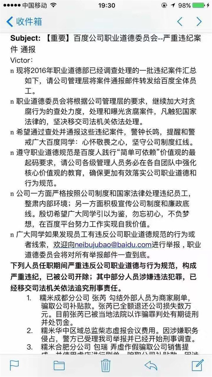 9月18日晚,百度职业道德委员会向全体员工发了一封通报邮件。