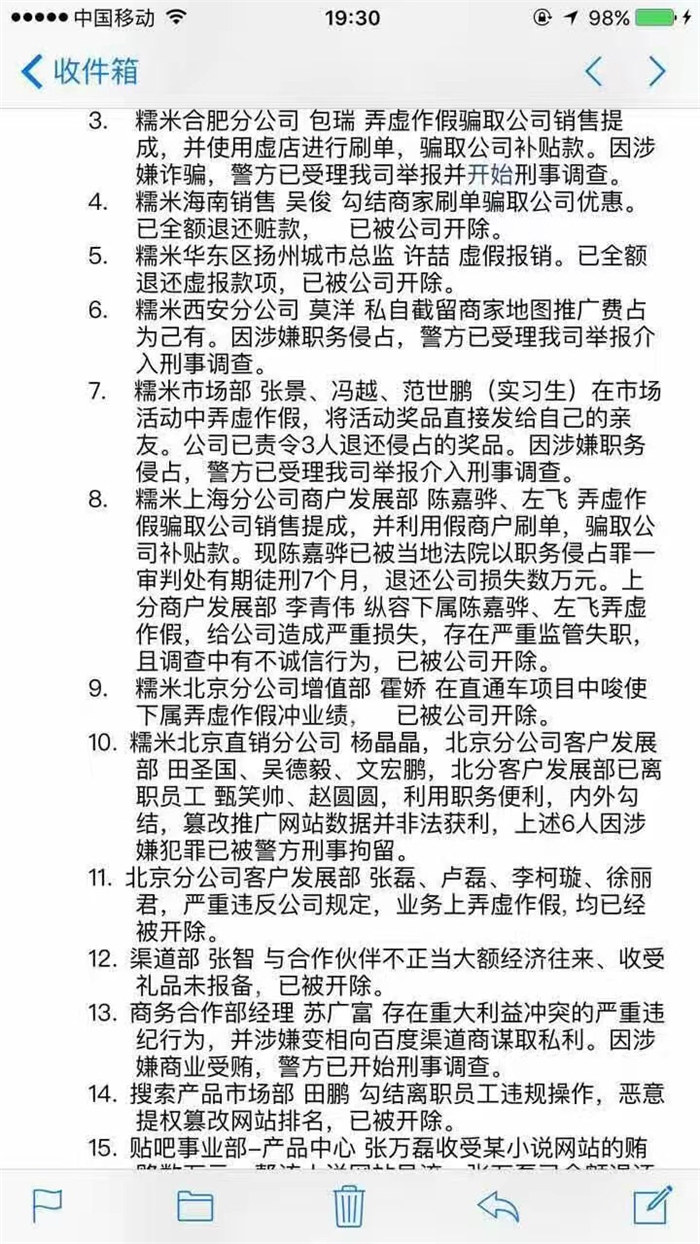 据界面新闻记者统计,总计通报开除共30名员工(其中包含1名实习生和2名已离职员工)。涉及业务部门包括百度糯米、百度直销分公司、渠道部、商务合作推广部、搜索产品市场部、百度贴吧、移动分发等多个部门。