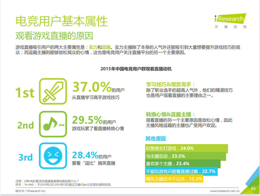 2015年开始,基于互联网的游戏直播产业借助网络基建的成熟和资本的入局疯狂增长。在早期游戏直播中,玩家的需求主要以学习和娱乐为主。2016年艾瑞咨询发布的报告认为,37%的用户观看游戏直播的原因是实力主播的技巧传授。