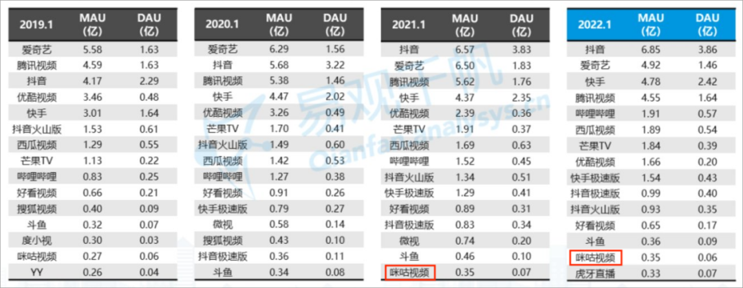 但是得到优质资源的咪咕,似乎也没能在视频平台混开。根据易观千帆《中国网络视频市场年度综合分析2022》,咪咕视频在2022北京冬奥会之前一年内数据无明显变化,跟上游的爱优腾隔着一道巨大的鸿沟。