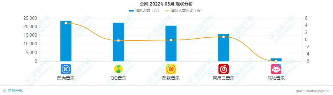 据易观千帆数据显示,今年3月国内移动音乐类App活跃度排行中,酷狗音乐、QQ音乐、酷我音乐月活分别达2.36亿、2.25亿及2.08亿,腾讯音乐借此包揽下榜单前三。网易云音乐月活为1.6亿,排在榜单第四位,而咪咕音乐用户活跃度远远低于同类App。