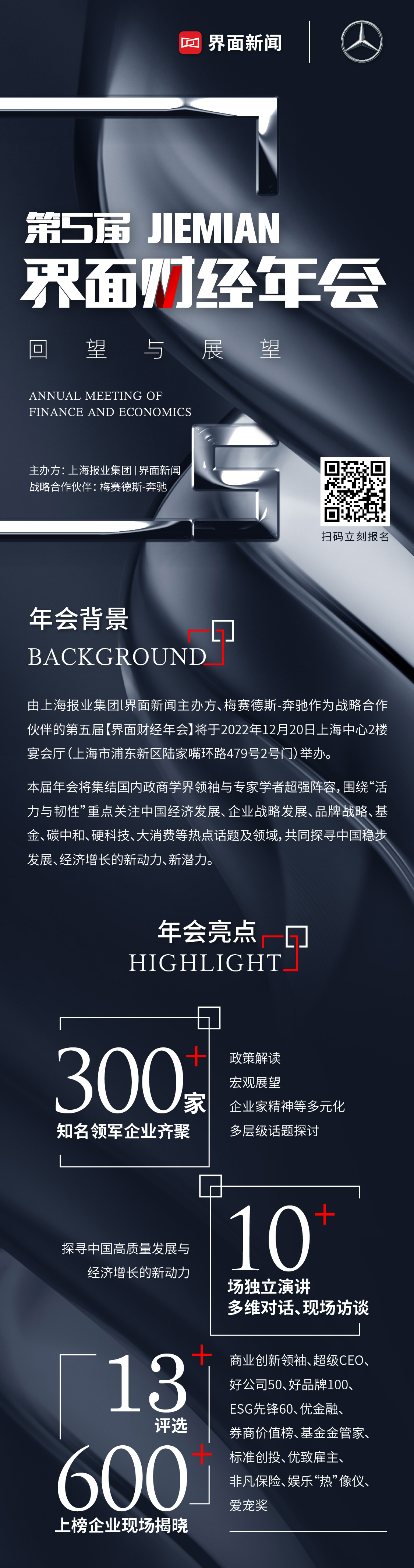 由上海报业集团 | 界面新闻主办的第五届【界面财经年会】将于2022年12月20日在上海中心(上海市浦东新区陆家嘴银城中路501号2号口)举办。特别鸣谢本次年会战略合作伙伴梅赛德斯-奔驰。