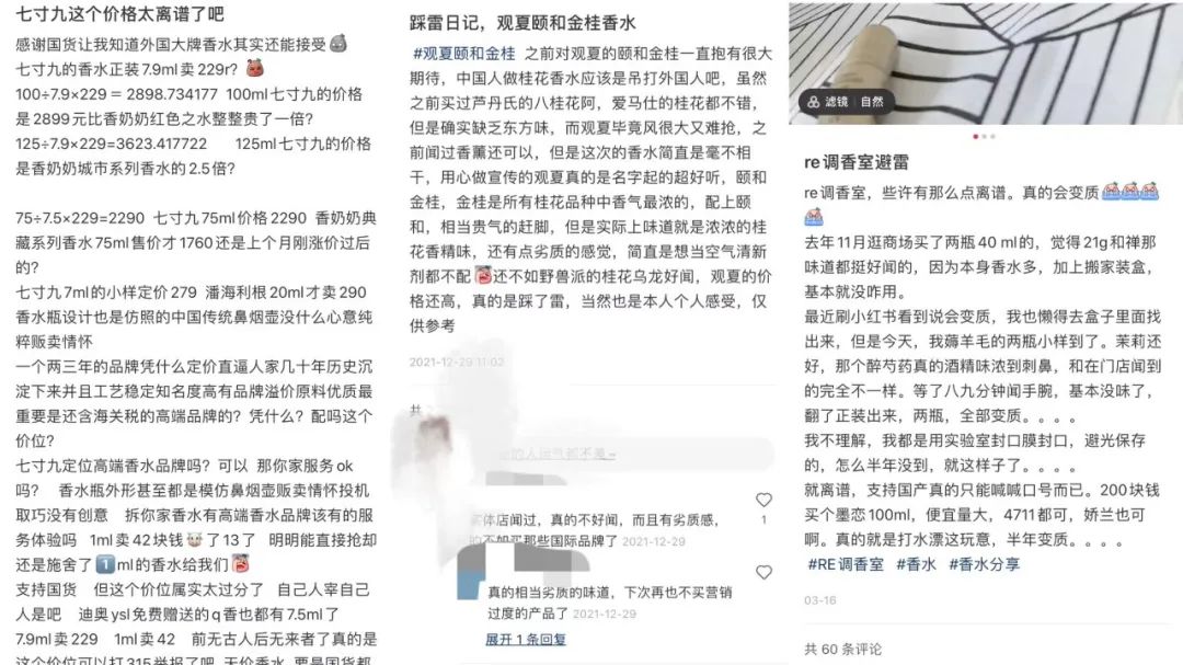 而在小红书上,有不少人和Alicia的感受一样,不少品牌的产品都被调侃为“五步散”、“廉价工业香”:“风吹得很大,我一下心动了,周四晚掐着点抢的,结果一整个大踩雷……”、“我买的裸和昆,人工香精味好重”……