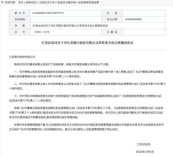 12月15日,江苏证监局官网公布的一张行政监管措施决定书显示,江苏银行因未对基金销售产品实行集中统一准入管理等3项问题被江苏证监局采取责令改正措施的决定。