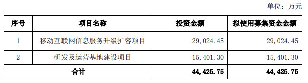 根据挖金客披露的招股说明书,首次公开发行股票的实际募得资金将用于“移动互联网信息服务升级扩容项目”和“研发及运营基地建设项目”,拟合计使用募集的资金4.44亿元。对比募资净额与拟使用的金额,可计算出挖金客在IPO的超募资金净额为0.73亿元。