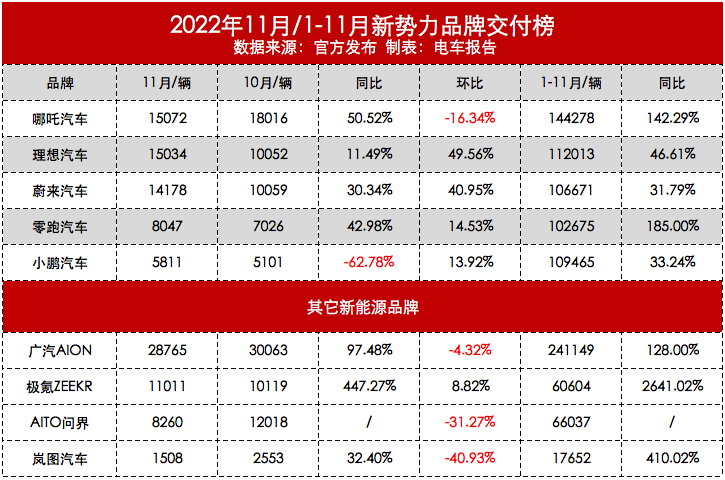 而排在第二位的,则是哪吒汽车,其11月交付量为15,072辆,同比增长51%,目前他们前11个月的累计交付为14.42辆,同比增长幅度达到了142%。从早年出海寻求发展,到如今以中高端车型冲榜成功,现在的哪吒可真有点想要在国内新能源车市“闹海”的意思。