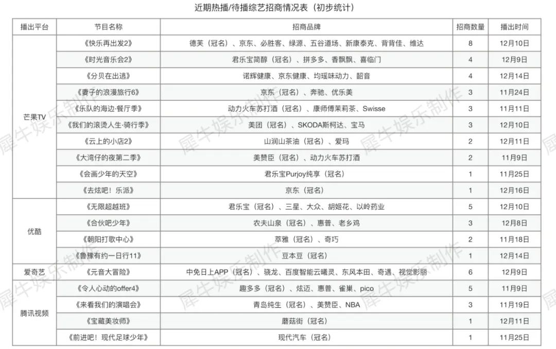 如今临近年底,事情似乎有了些转机。事实上,下半年综艺招商的整体表现要明显优于上半年,先是Q3接连涌现出《披荆斩棘2》《这!就是街舞5》等多档10余家赞助的项目,再到如今的Q4,频繁上新的新老综艺都取得了不错的招商成绩。