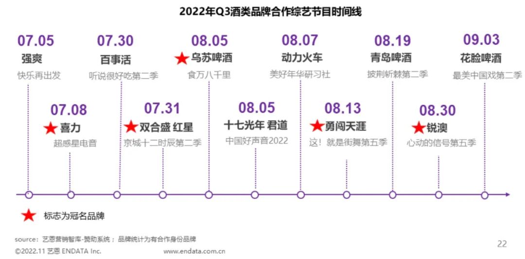 酒类品牌方面,仅Q3一季度,市场共有13个酒类品牌在11个综艺里露出。据艺恩发布的《2022Q3综艺赞助市场报告》显示,酒类品牌多在盛夏销售旺季投放不同节点的综艺,如百事活牵手了7月的《听说很好吃2》,动力火车合作了8月的《美好年华研习社》,花脸啤酒则投放了9月的《最美中国戏2》。