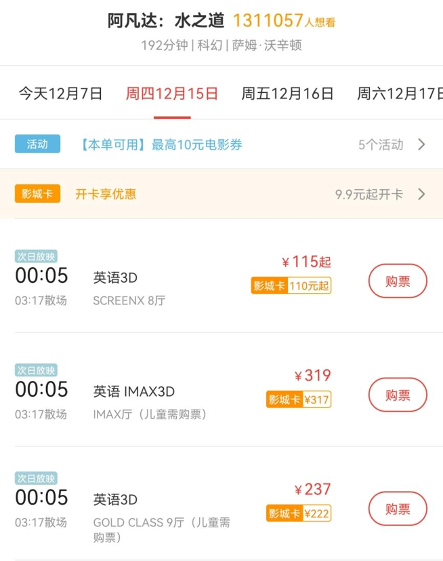 “太贵了,两三百的价格我选择看话剧。或者上映一阵子后去郊区看。”不出所料地,预售期间,网络流传着票价高达300多元的截图,《阿凡达2》的“高票价”被不少影迷吐槽。其发行通知中的票房结算标准为:数字3D 25元/人;IMAX、激光IMAX 30元/人;CINITY 30元/人,单看似乎与其他影片差别不大,但高特殊影厅占比,决定了票价不会低。