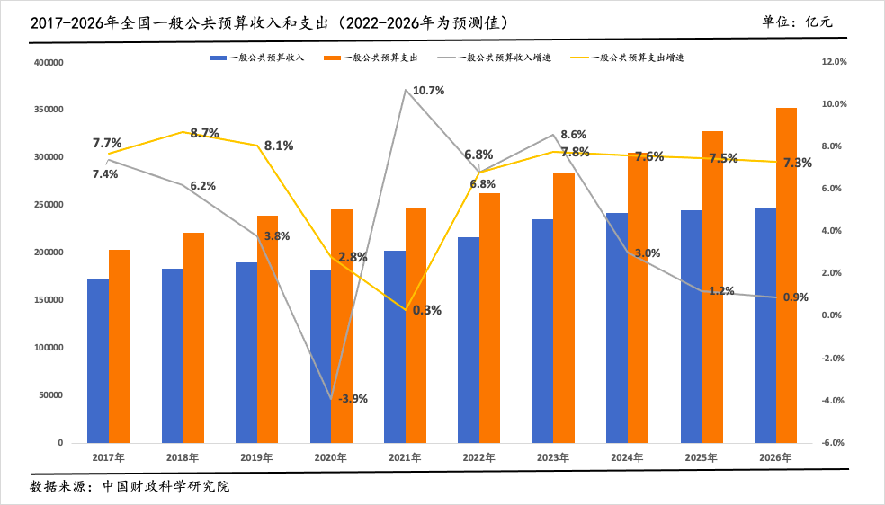 中国财政科学研究院日前出版的《财政蓝皮书:中国财政政策报告(2022)》指出,在国内外不确定因素增强的背景下,预计2022-2026年全国一般公共预算收入增长率将逐年放缓。为了稳经济,积极财政政策将持续发力,一般公共预算支出在这一期间将保持一定强度,预计平均增速在7.4%以上。