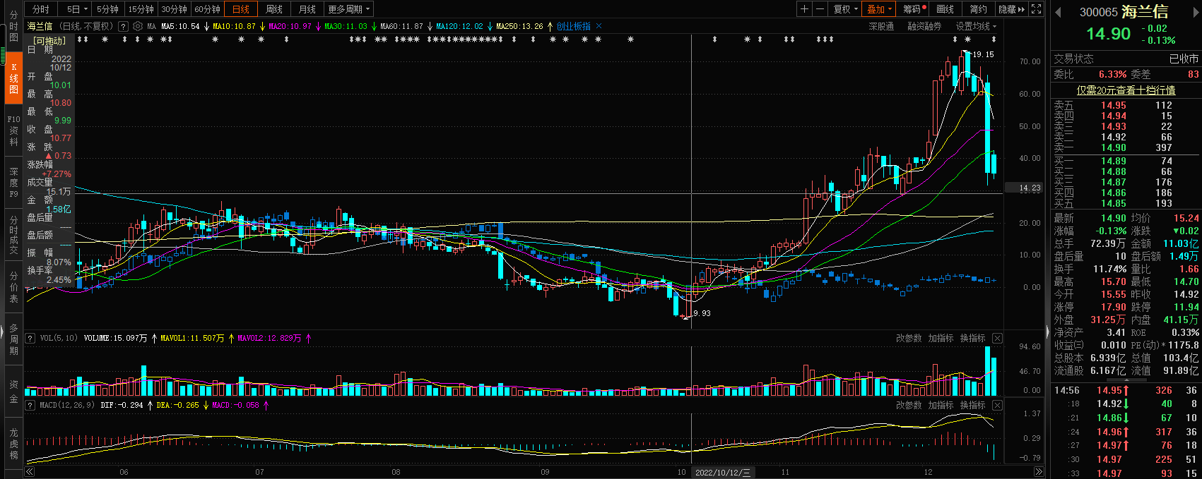 不过,海兰信近两日的股价回调也十分“凶狠”。截至12月16日收盘,该股主力资金净流出468万元,收报14.9元/股,较高点已跌去22%。