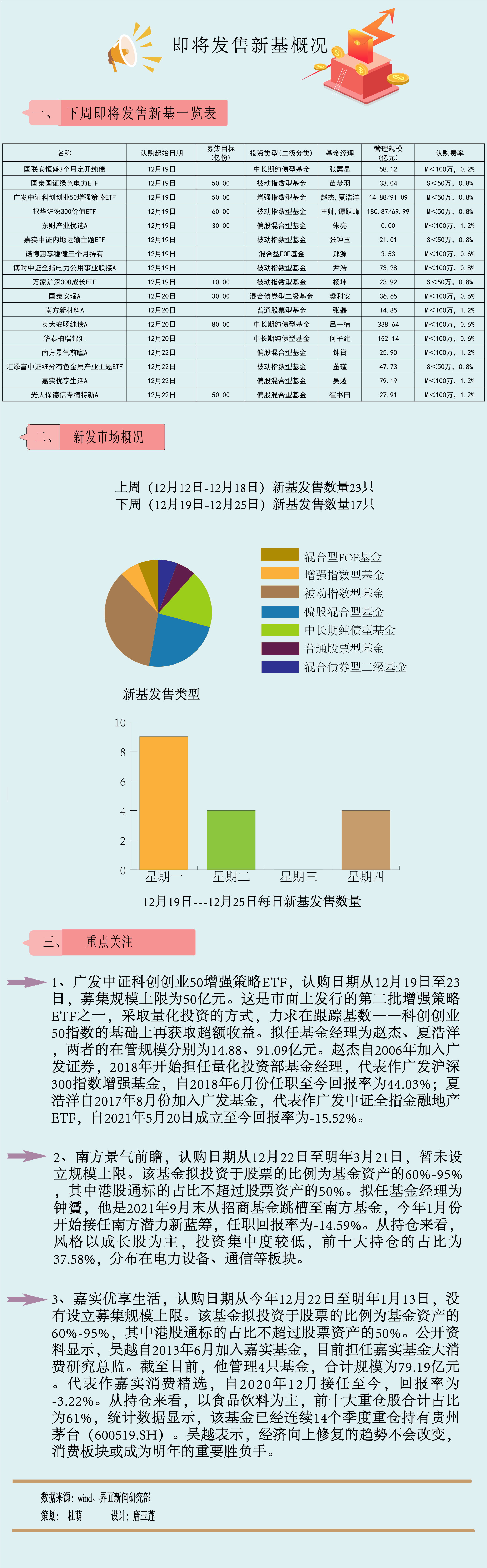 下周,共有17只新基金发行,其中被动指数型基金有6只,偏股混合型基金有4只,中长期纯债基金有3只。嘉实基金吴越、南方基金钟贇等多位知名基金经理也有新品发售。