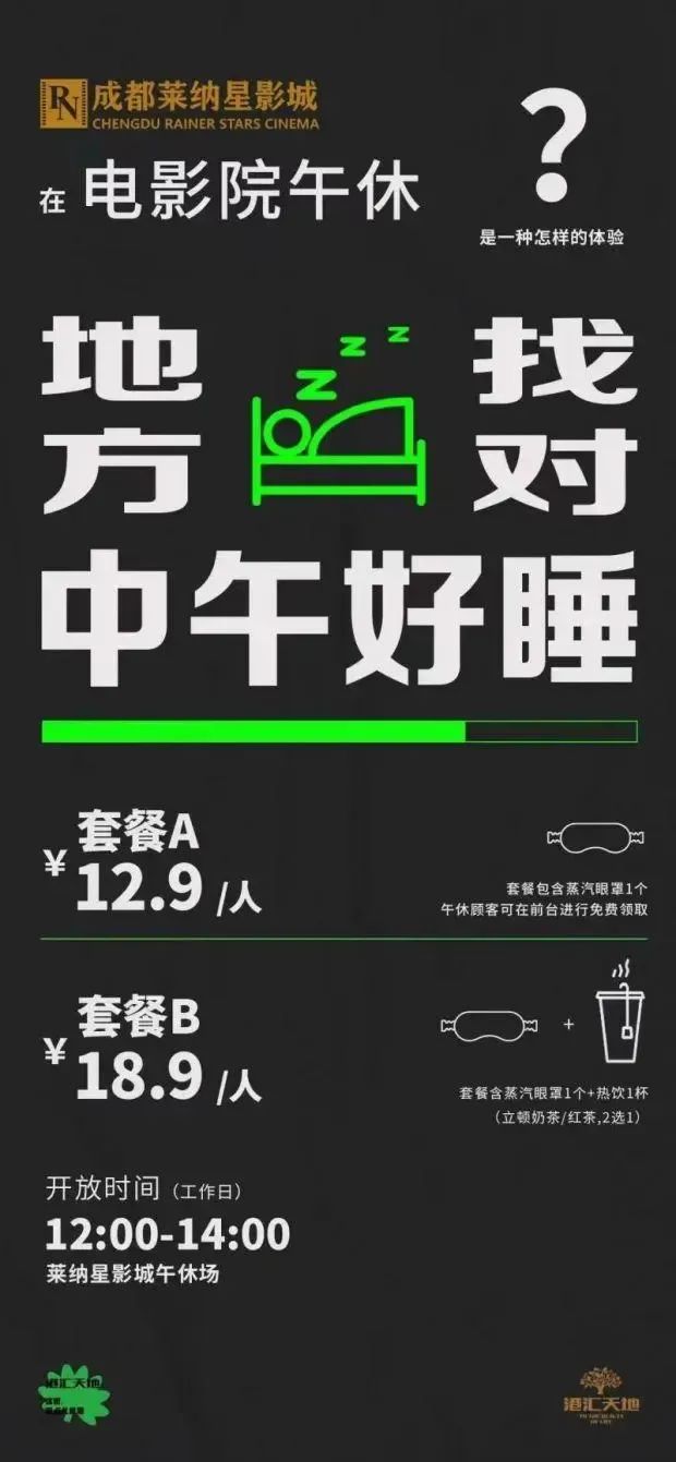 这两年,我们也陆续有很多自救的手段,比如成都一家影院推出的“卖午休”,三个月前,我们也开展了。我们会拿出影院的贵宾厅作为午休室,椅子类似头等舱的座椅,能躺下来会更舒服。收费的话,一般2小时40-50元左右,套餐里还会附赠水和爆米花。