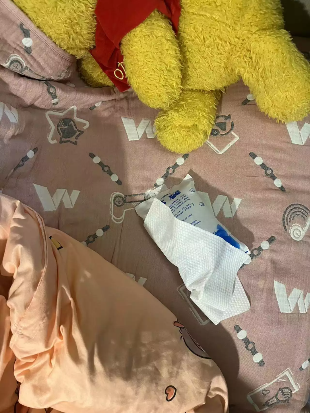 当时家里的退烧贴用光了,我就胡乱从冰箱里拿出了一贴面膜糊在脸上降温,不到十分钟面膜纸就干了,我只能从冰箱翻出了几个冰袋用。